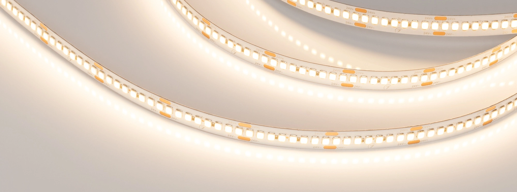 Открытая высокоэффективная 150 лм/Вт светодиодная лента. Светодиоды SMD 2835 (240 шт/м) белого теплого цвета свечения (3000 К), минимальный отрезок 33.33 мм, 8 светодиодов. Для энергоэффективного освещения. Равномерная засветка больших поверхностей. Предназначена для применения в основном освещении жилых и офисных помещений. Подсветка рекламных конструкций и витрин, декоративной подсветки интерьера, потолочных ниш. Обязательная установка на профиль.
