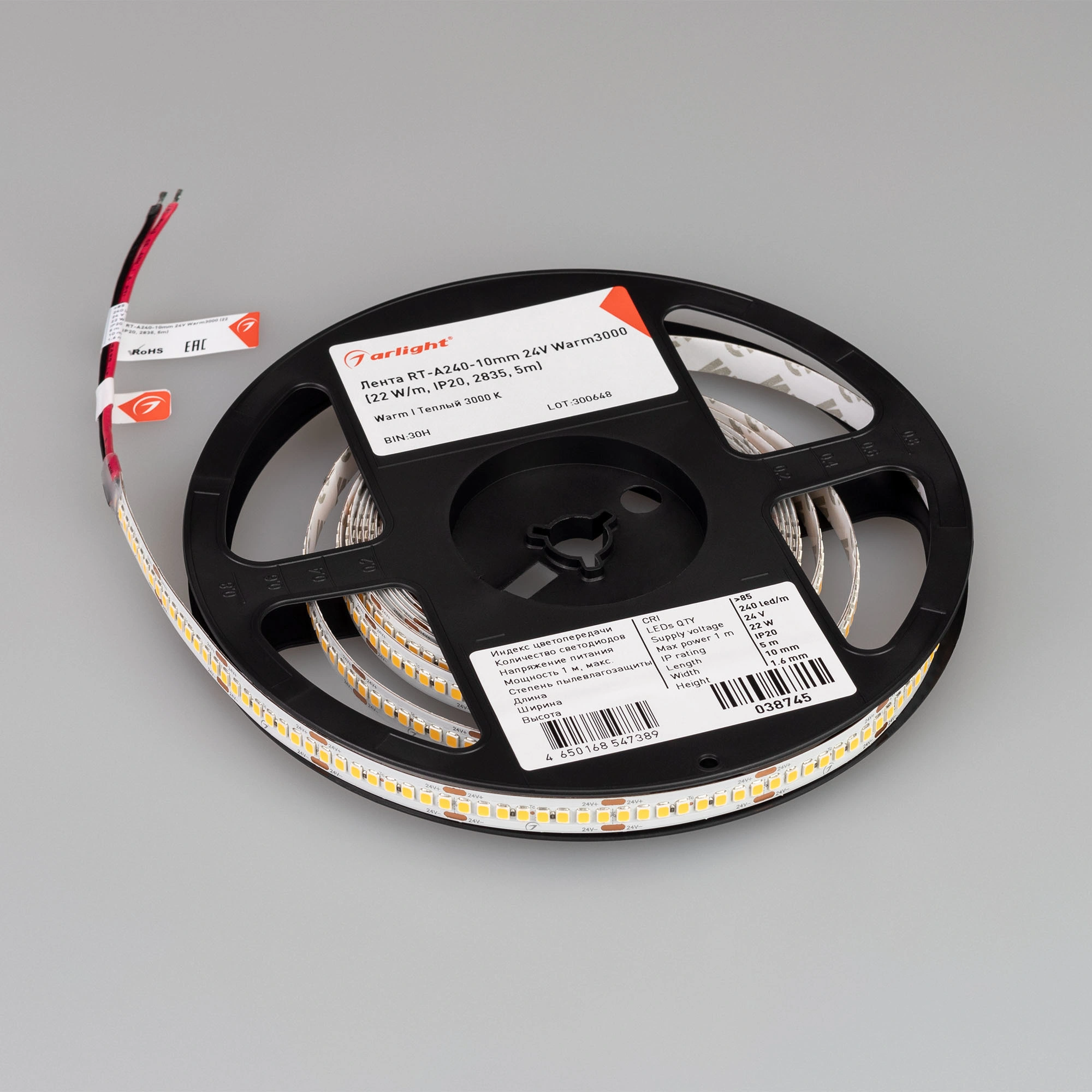 Светодиодная лента RT-A240, открытая. Светодиоды 2835, 240 шт/м (1200 шт на 5 м), белая плата, ширина 10 мм, скотч 3M. Цвет ТЕПЛЫЙ 3000 K, цветопередача CRI>85, угол 120°. Питание 24 В, мощность 22 Вт/м (110 Вт на 5 м). Размеры 5000x10x1.6 мм. Мин.отрезок 33.33 мм, 8 светодиодов. Цена за 1 м.