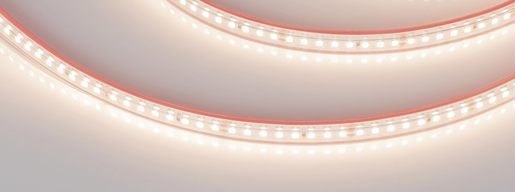 Герметичная светодиодная лента шириной 10 мм в силиконовой трубке (экструзия, без сдвига ЦТ) с высокой степенью пылевлагозащиты IP67. Светодиоды SMD 2835 (160 шт/м) теплого белого цвета свечения (3300 - 3600 К), индекс цветопередачи CRI>85. Мощность 12 Вт/м, напряжение питания 24 В. Минимальный отрезок 50 мм (8 светодиодов). Освещение интерьеров и создание декоративной подсветки. Оформление наружной рекламы и витрин. Использование в помещениях и на улице.
