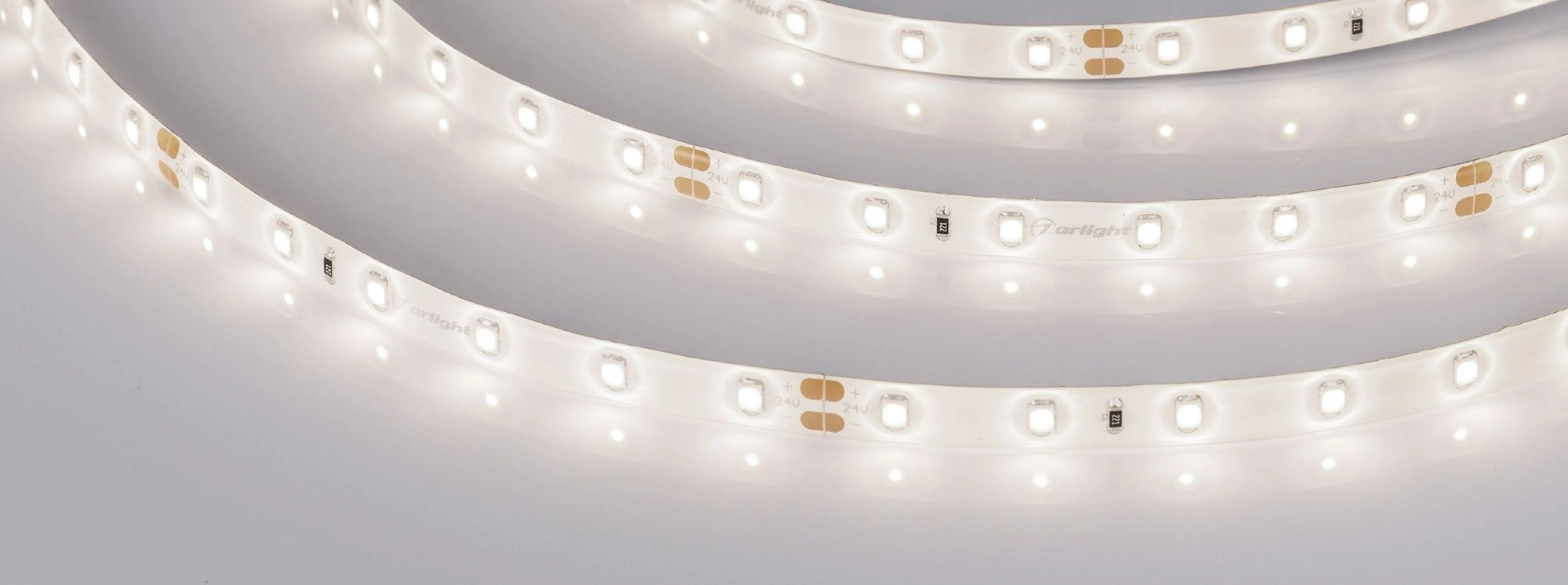 Герметичная светодиодная лента шириной 8 мм с высокой степенью пылевлагозащиты IP65 (силикон сверху). Светодиоды SMD 2835 (120 шт/м) с теплым белым цветом свечения (2750 - 3250 К) и индексом цветопередачи CRI>85. Мощность 14.4 Вт/м, напряжение питания 24 В. Минимальный отрезок 50 мм (6 светодиодов). Освещение интерьеров и создание декоративной подсветки, оформление наружной рекламы и витрин. Возможно использование во влажных помещениях. Обязательна установка на профиль.