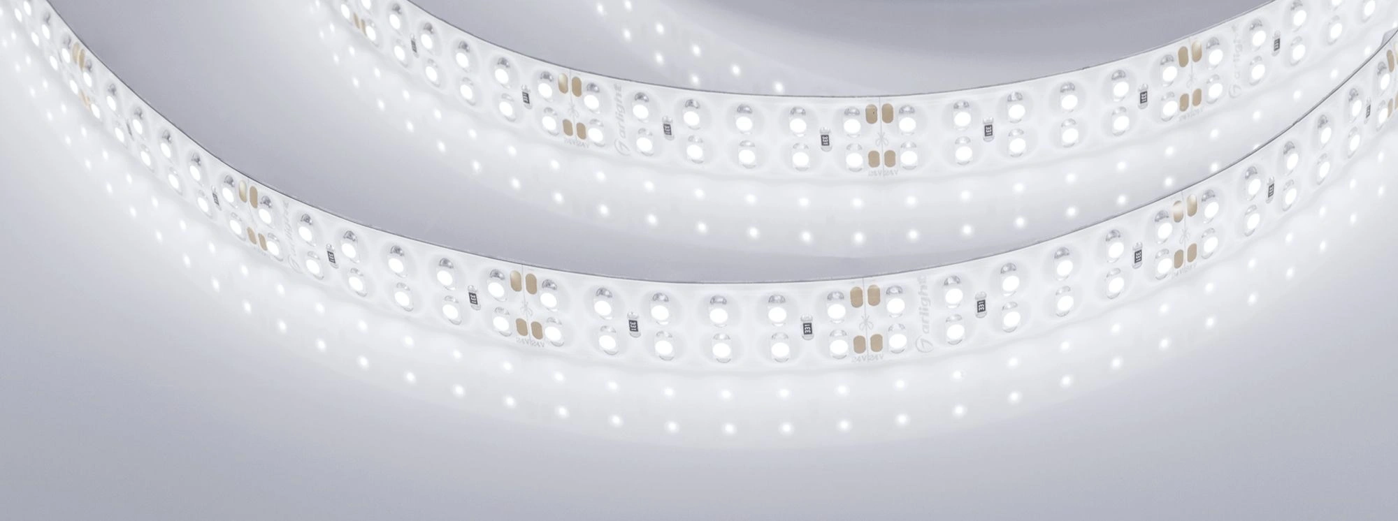 Герметичная двухрядная светодиодная лента шириной 15 мм с высокой степенью пылевлагозащиты IP65 (силикон сверху). Светодиоды SMD 2835 (240 шт/м) белого цвета свечения (6000 К). Индекс цветопередачи CRI>85. Мощность 19.2 Вт/м, напряжение питания 24 В. Минимальный отрезок 50 мм (12 светодиодов). Может использоваться с любыми алюминиевыми профилями. Встроенные линии света для основного освещения. Создание накладных и подвесных светильников.