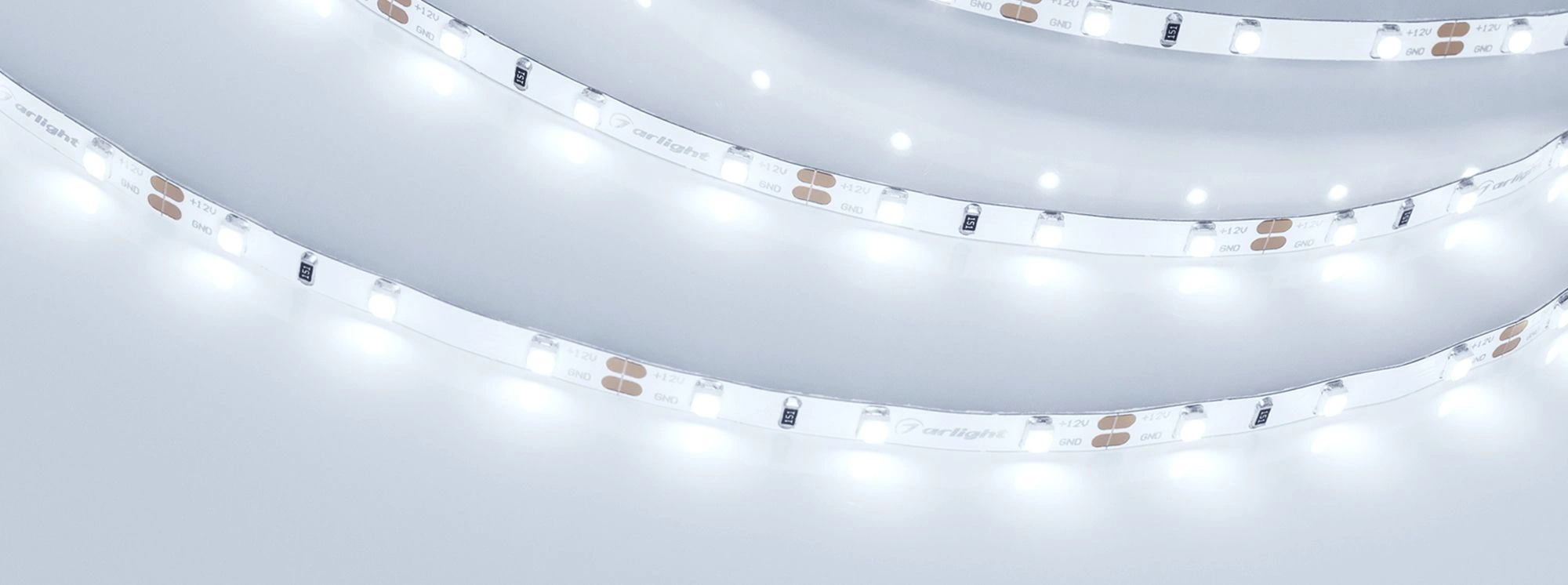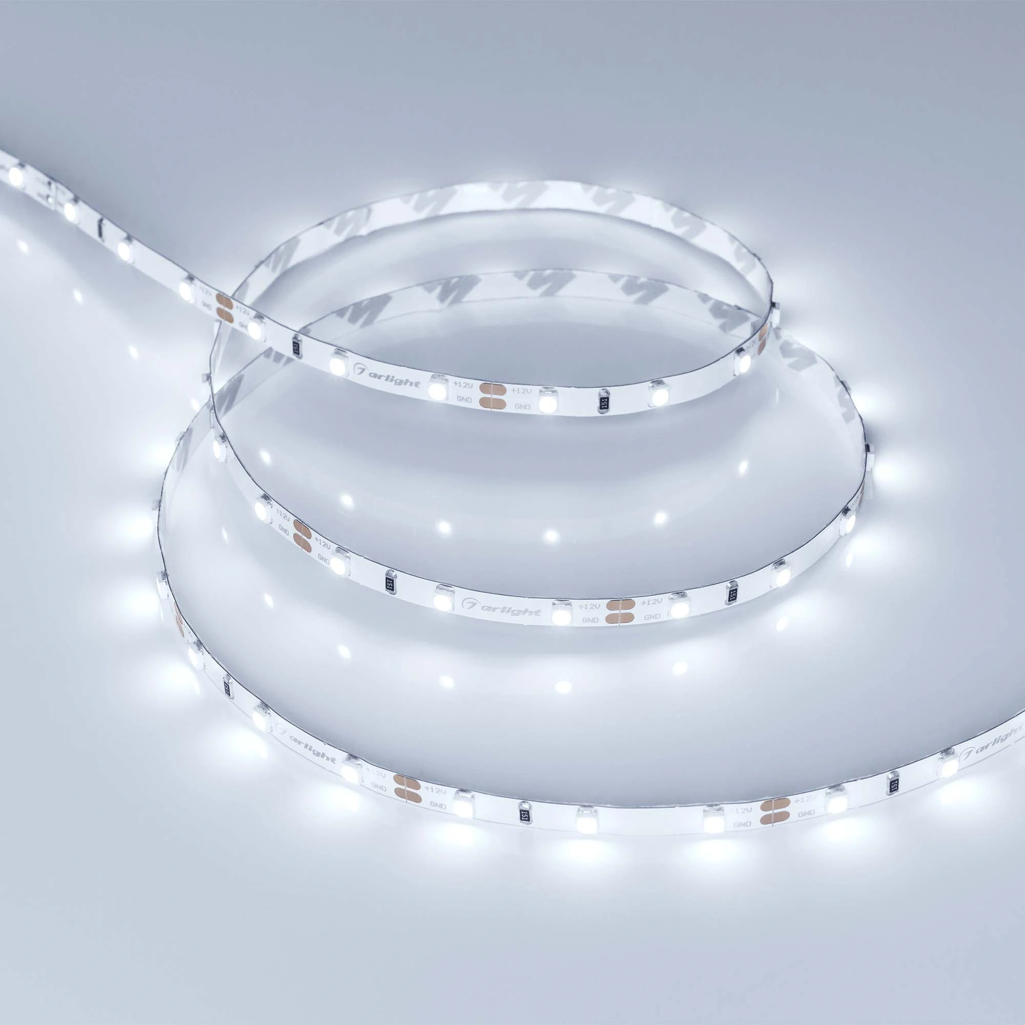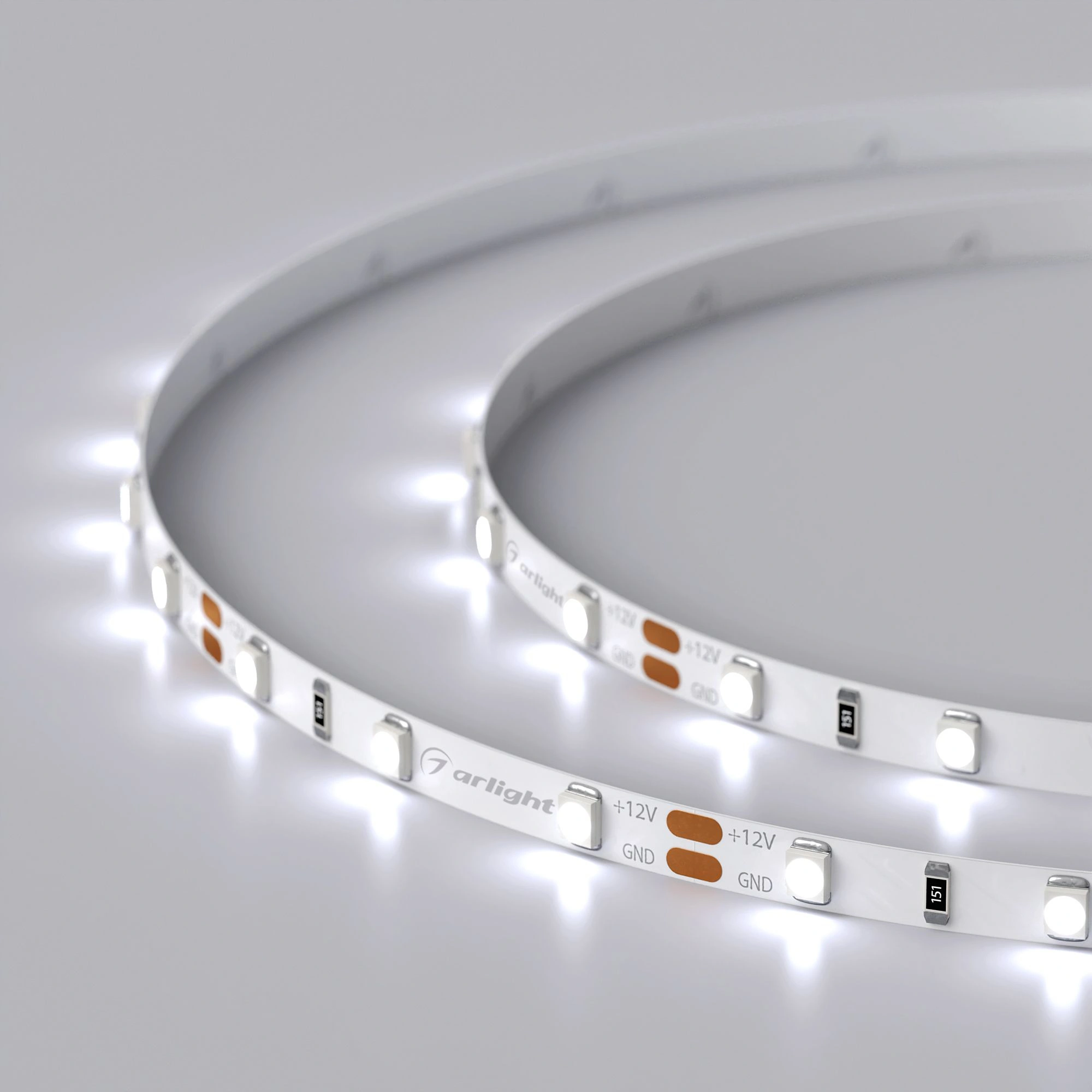 Светодиодная узкая лента RT-A60, открытая. Светодиоды 2835, 60 шт/м (300 шт на 5 м), белая плата, ширина 5 мм, скотч 3M. Цвет ХОЛОДНЫЙ 8000 K, цветопередача CRI >85, угол 120°. Питание 12V, мощность 4.8 Вт/м (24 Вт на 5 м). Размеры 5000x5x1.5 мм. Мин.отрезок 50 мм, 3 светодиода. Цена за 1м.