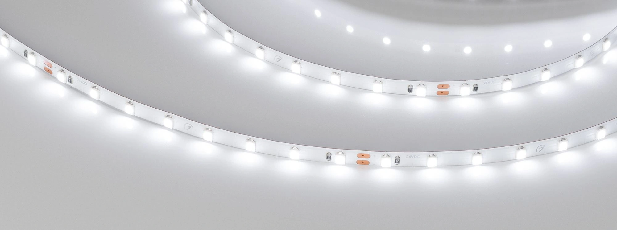 Светодиодная узкая лента RT-A80, открытая IP20. Светодиоды 2835, 80 шт/м (400 шт на 5 м), белая плата 5 мм, скотч 3M. Цвет БЕЛЫЙ 6000 K , цветопередача CRI>90 , угол 120°. Питание 24 В, мощность 5 Вт/м (25 Вт на 5 м). Размеры 5000x5x1.5 мм. Мин.отрезок 100 мм, 8 светодиодов. Цена за 1м.