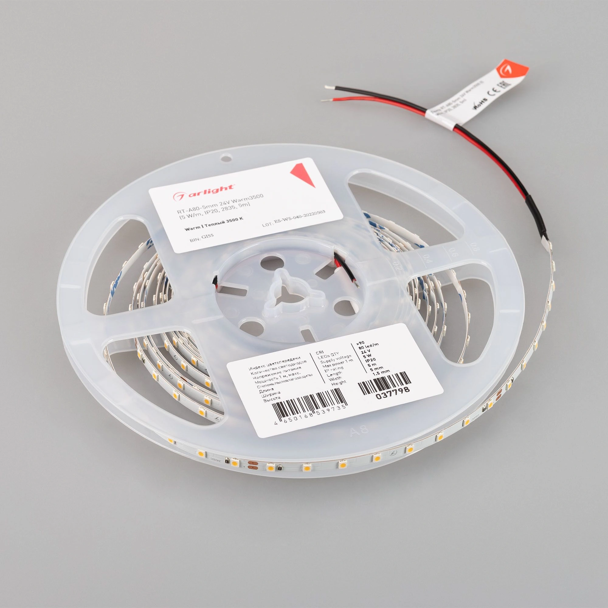 Светодиодная узкая лента RT-A80, открытая IP20. Светодиоды 2835, 80 шт/м (400 шт на 5 м), белая плата 5 мм, скотч 3M. Цвет ТЁПЛЫЙ 3500 K , цветопередача CRI>90 , угол 120°. Питание 24 В, мощность 5 Вт/м (25 Вт на 5 м). Размеры 5000x5x1.5 мм. Мин.отрезок 100 мм, 8 светодиодов. Цена за 1м.