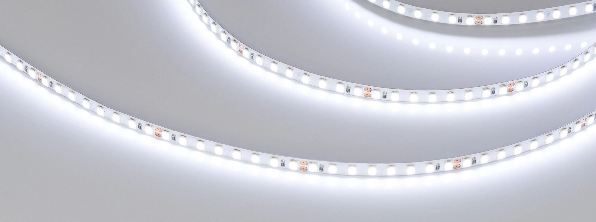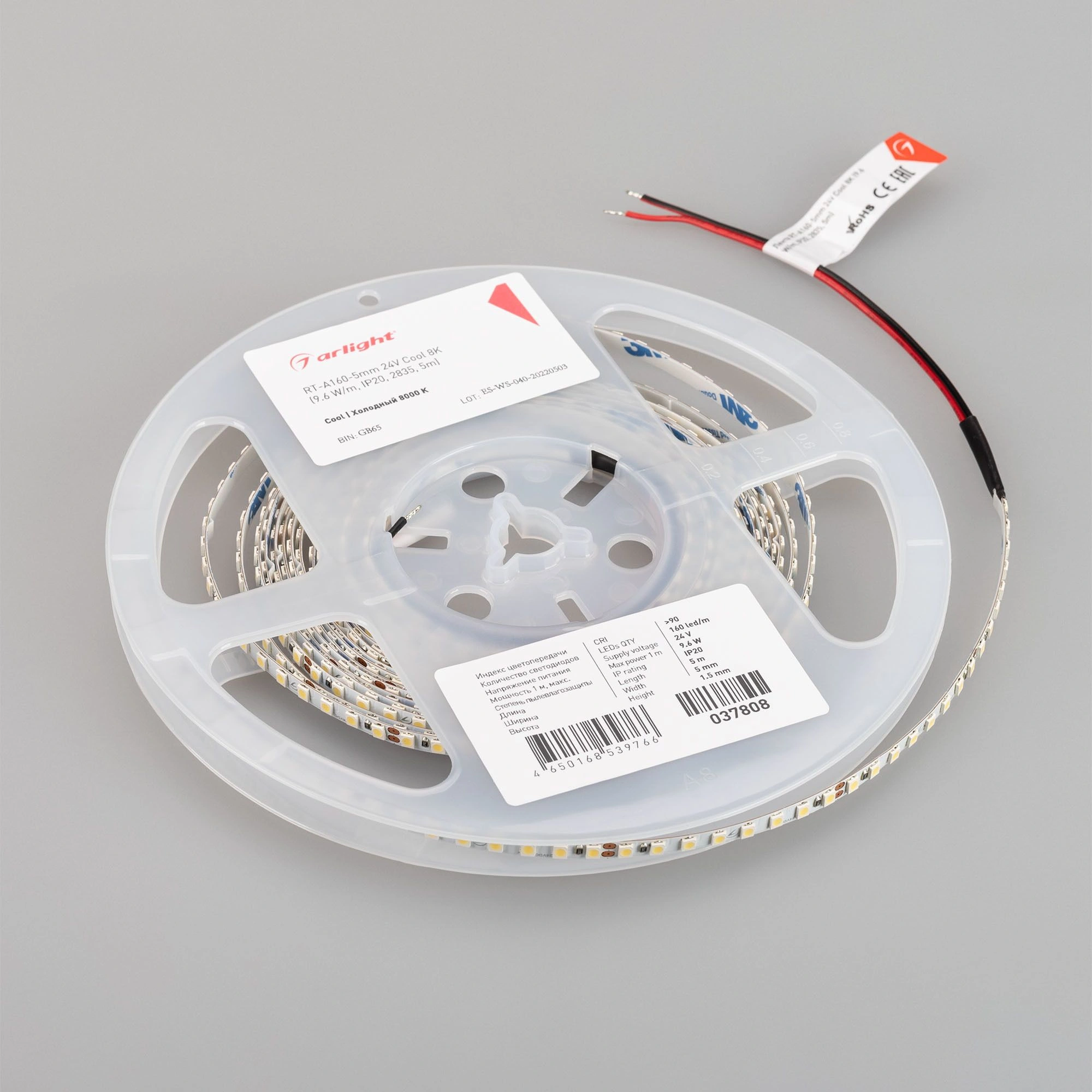 Светодиодная лента RT-A160, открытая IP20. Светодиоды 2835, 160 шт/м (800 шт на 5 м), белая плата 5 мм, скотч 3M. Цвет ХОЛОДНЫЙ 8000 K , цветопередача CRI>90 , угол 120°. Питание 24 В, мощность 9.6 Вт/м (48 Вт на 5 м). Размеры 5000x5x1.5 мм. Мин.отрезок 50 мм, 8 светодиодов. Цена за 1м.