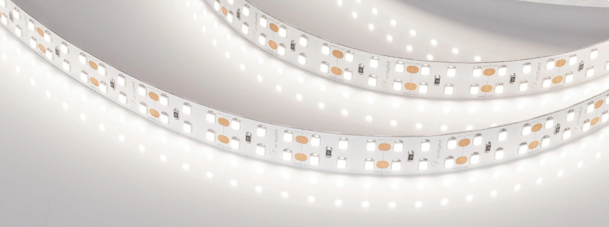 Светодиодная широкая лента RT-A240, открытая. Светодиоды 2835, 240 шт/м (1200 шт на 5 м), белая плата, ширина 15 мм, скотч 3M. Цвет ДНЕВНОЙ 5000 K, цветопередача CRI 95..98, угол 120°. Питание 24V, мощность 19.2 Вт/м (96 Вт на 5 м). Размеры 5000x15x1.5 мм. Мин. отрезок 25 мм, 6 светодиодов. Цена за 1 м.