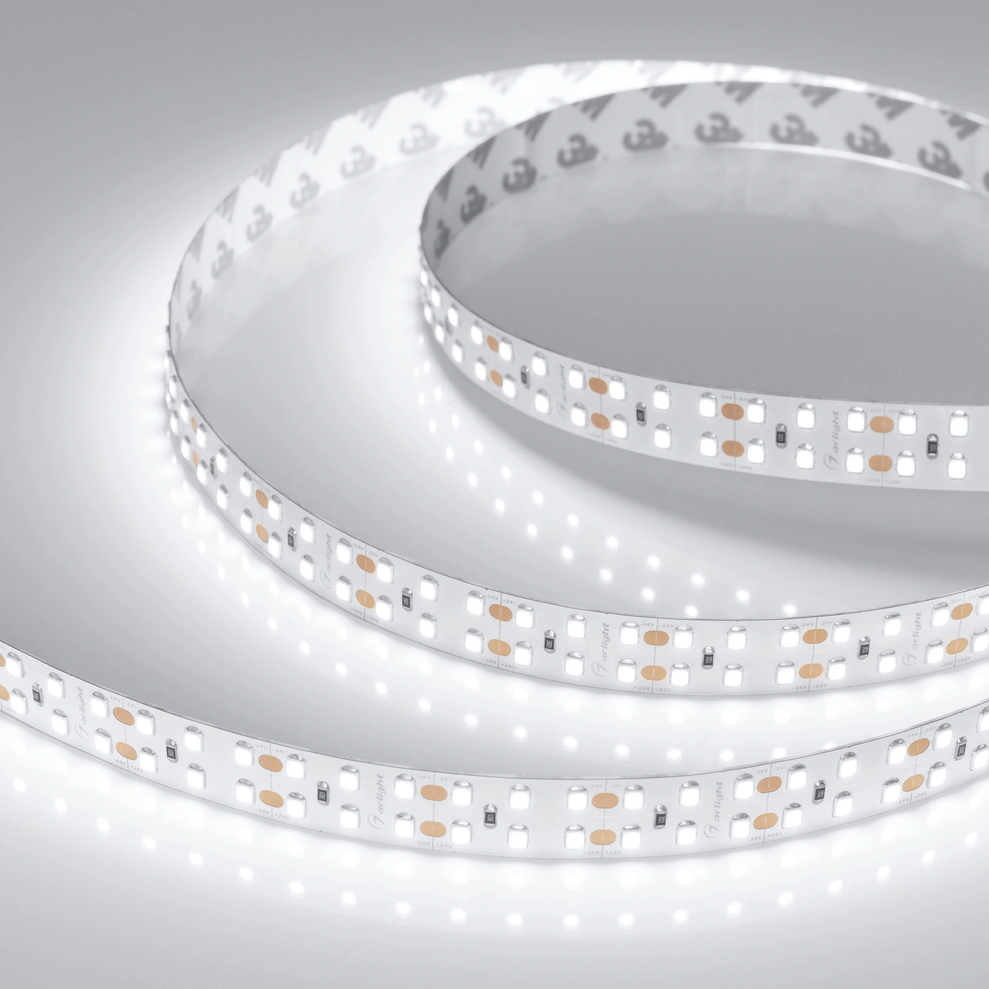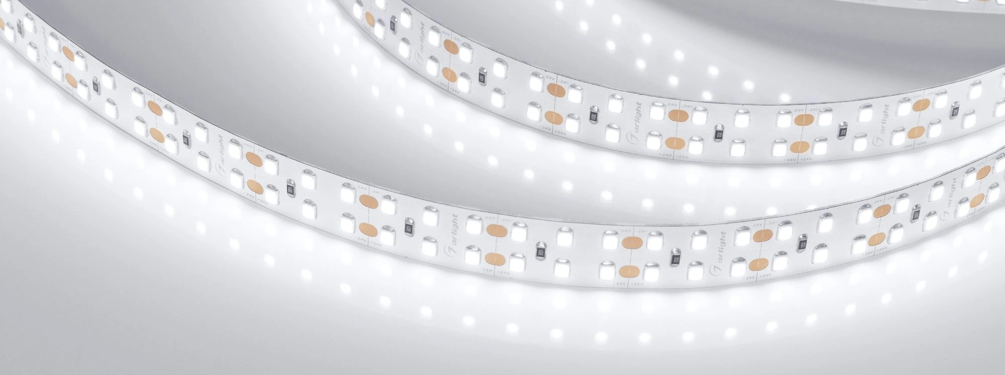 Светодиодная широкая лента RT-A240, открытая. Светодиоды 2835, 240 шт/м (1200 шт на 5 м), белая плата, ширина 15 мм, скотч 3M. Цвет БЕЛЫЙ 6000 K, цветопередача CRI>85, угол 120°. Питание 24V, мощность 19.2 Вт/м (96 Вт на 5 м). Размеры 5000x15x1.5 мм. Мин. отрезок 25 мм, 6 светодиодов. Цена за 1 м.