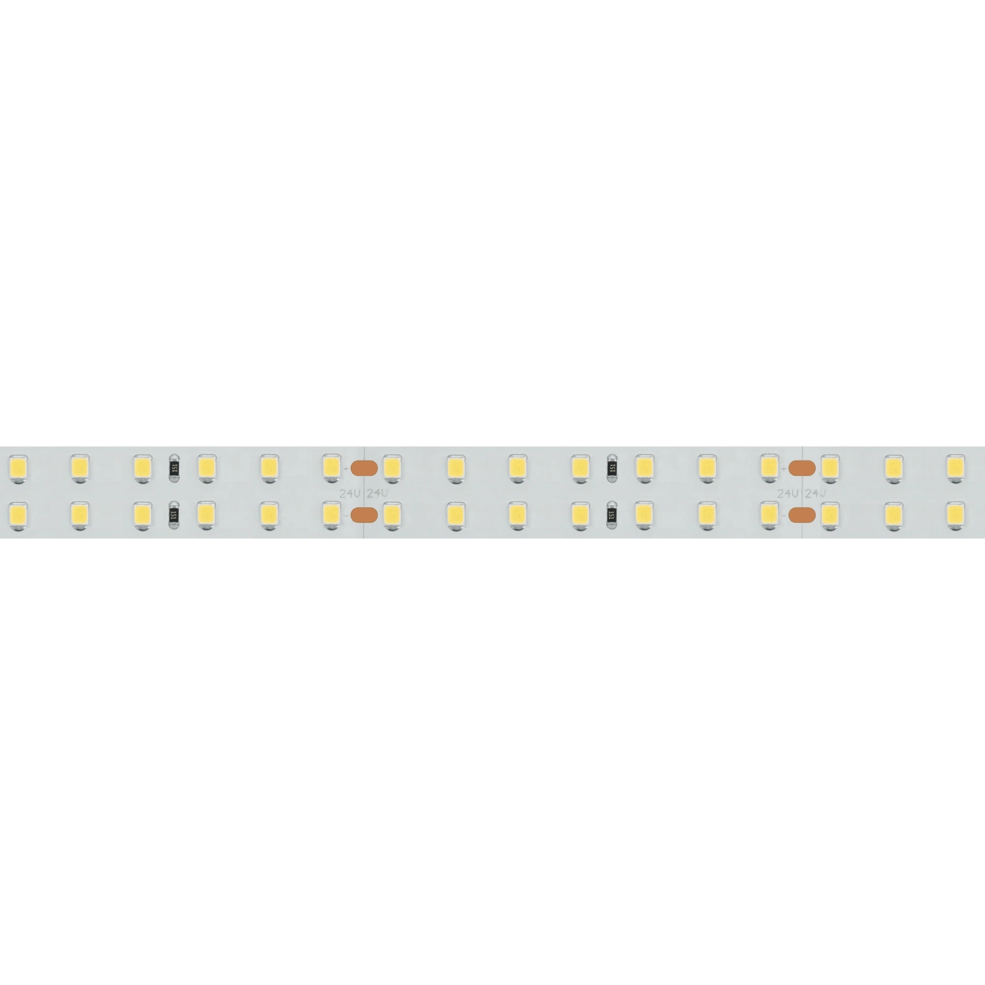 Широкая двухрядная лента LUX шириной 15 мм с индексом цветопередачи CRI>85 и высокой световой эффективностью >125 лм/Вт. Светодиоды SMD 2835 (196 шт/м) с теплым белым цветом свечения (2600–2800 К). Мощность 20 Вт/м, напряжение питания 24 В. Минимальный отрезок 71.43 мм (14 светодиодов). Встроенные линии света для основного освещения. Создание накладных и подвесных светильников из алюминиевого профиля.