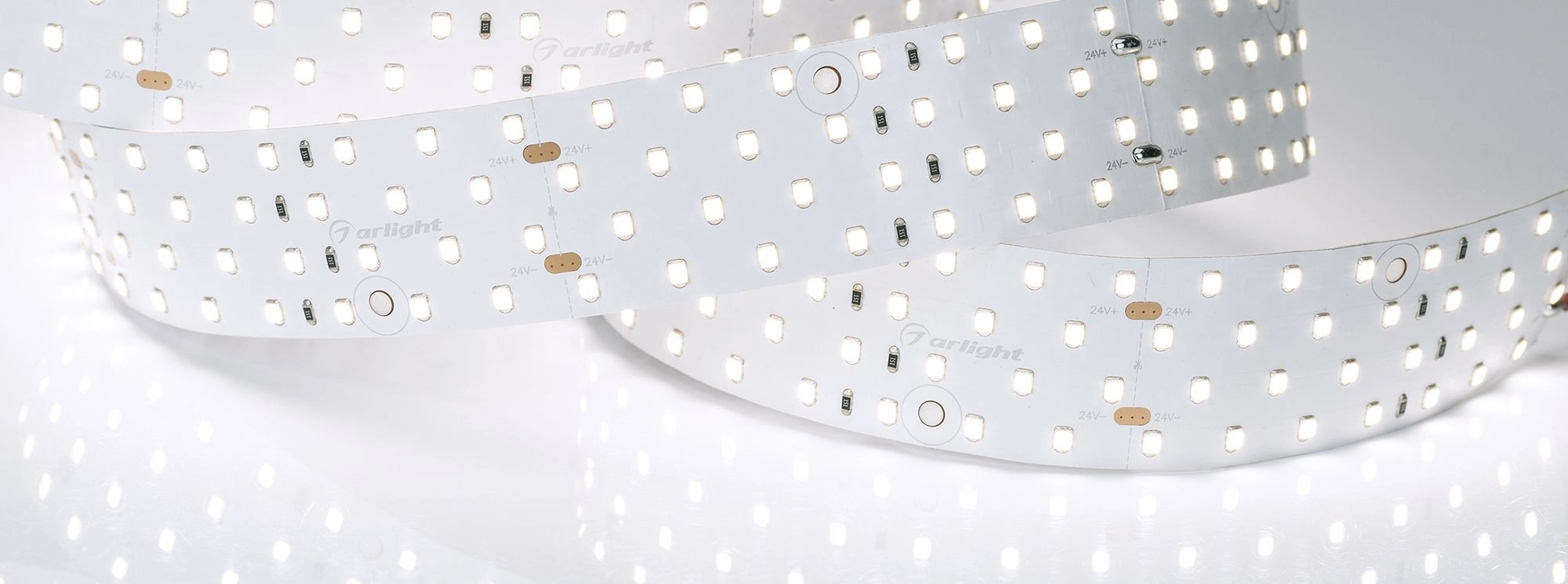 Широкая четырехрядная лента LUX шириной 36 мм с индексом цветопередачи CRI>85 и высокой световой эффективностью. Светодиоды SMD 2835 (280 шт/м) с белым цветом свечения (6000 К). Мощность 30 Вт/м, напряжение питания 24 В. Минимальный отрезок 100 мм (28 светодиодов). Может использоваться с любыми профилями. Встроенные линии света для основного освещения. Создание накладных и подвесных светильников из алюминиевого профиля.