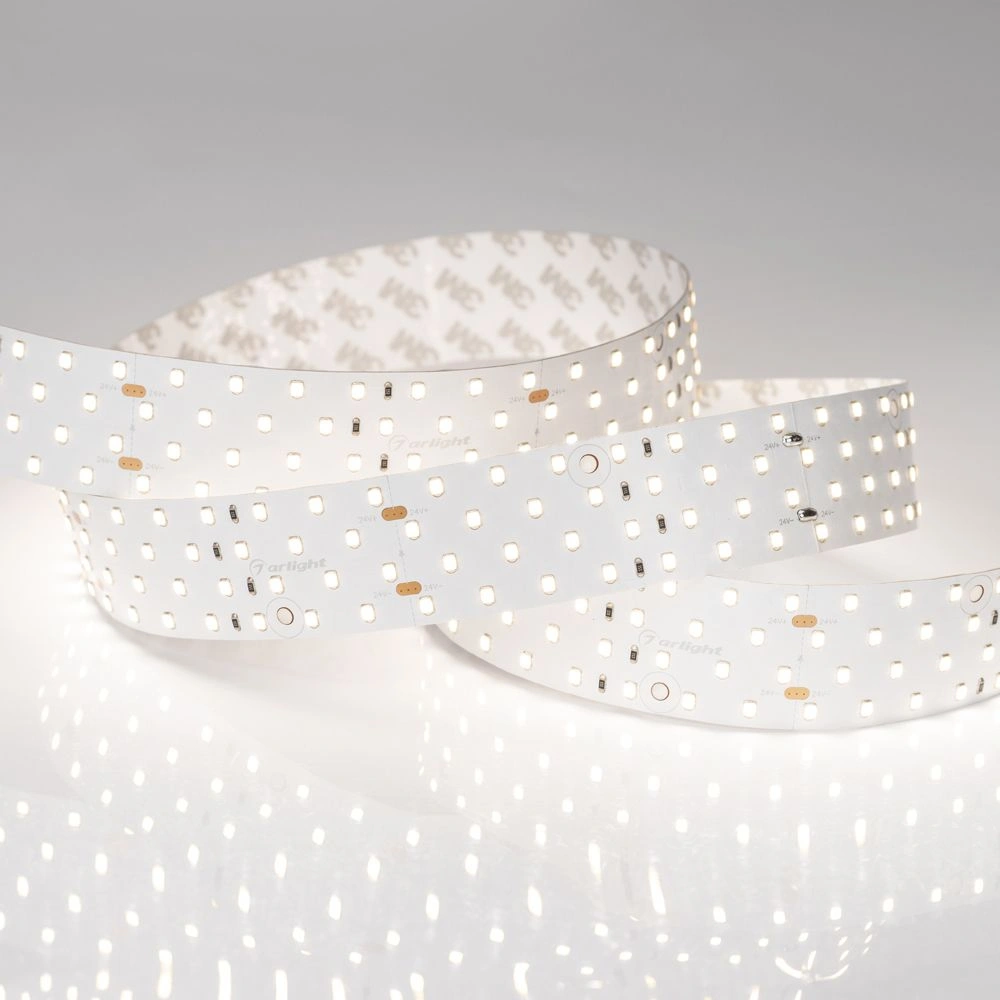 Широкая четырехрядная лента LUX шириной 36 мм с индексом цветопередачи CRI>85 и высокой световой эффективностью. Светодиоды SMD 2835 (280 шт/м) с дневным белым цветом свечения (4000 К). Мощность 30 Вт/м, напряжение питания 24 В. Минимальный отрезок 100 мм (28 светодиодов). Может использоваться с любыми профилями. Встроенные линии света для основного освещения. Создание накладных и подвесных светильников из алюминиевого профиля.