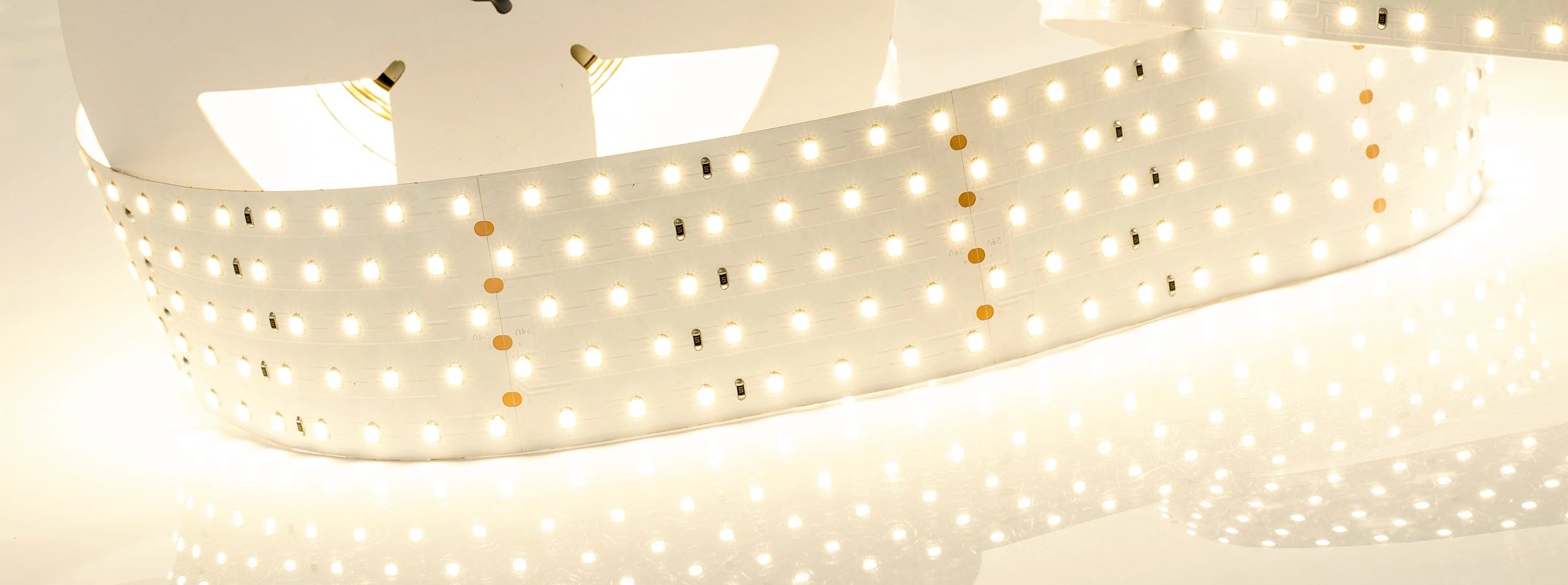 Широкая лента LUX шириной 58 мм с индексом цветопередачи CRI>85. Светодиоды SMD 2835 (350 шт/м) с цветовой температурой 2900–3100 К. Мощность 36 Вт/м, напряжение питания 24 В. Минимальный отрезок 100 мм (35 светодиодов). Может использоваться с любыми профилями. Равномерное свечение по всей ширине профиля. Встроенные широкие линии света для основного освещения. Создание накладных и подвесных светильников из алюминиевого профиля.