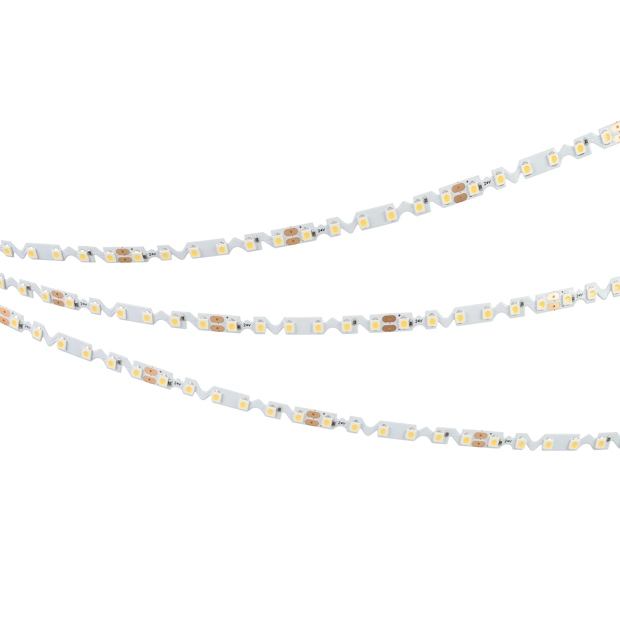 Гибкая лента с фигурной платой в форме волны, легко изгибается на плоскости. Светодиоды smd 2835, 120шт/м (600шт на 5м), белая плата, скотч 3М. Цвет ТЕПЛЫЙ 3500K. Питание 24 В, мощность 9.6 Вт/м (48 Вт на 5 м), угол 120°, цветопередача CRI>90. Размеры 5000х6х1.3мм. Мин.отрезок 50мм, 6 светодиодов. Цена за 1м.