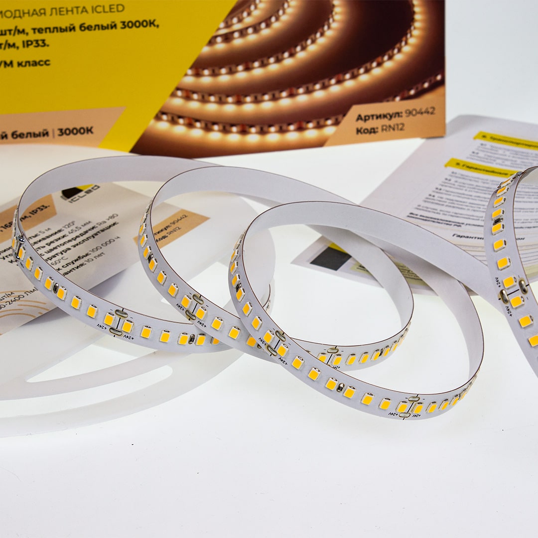 Светодиодная лента премиум класса. Тип светодиода 2835, 176 светодиода на метр (880шт на 5 метров), угол свечения 120 градусов, цвет свечения теплый белый 3000K. Напряжение 24V, мощность 80W на 5 метров(16W на метр), размеры 10x1,3x5000мм. Световой поток на 5 метров 10800-12000Lm. Класс защиты IP33. Катушка 5 метров. Рекомендуется устанавливать на теплоотвод для лучшего охлаждения. Размеры упаковки 217x190x23мм, Вес 171г