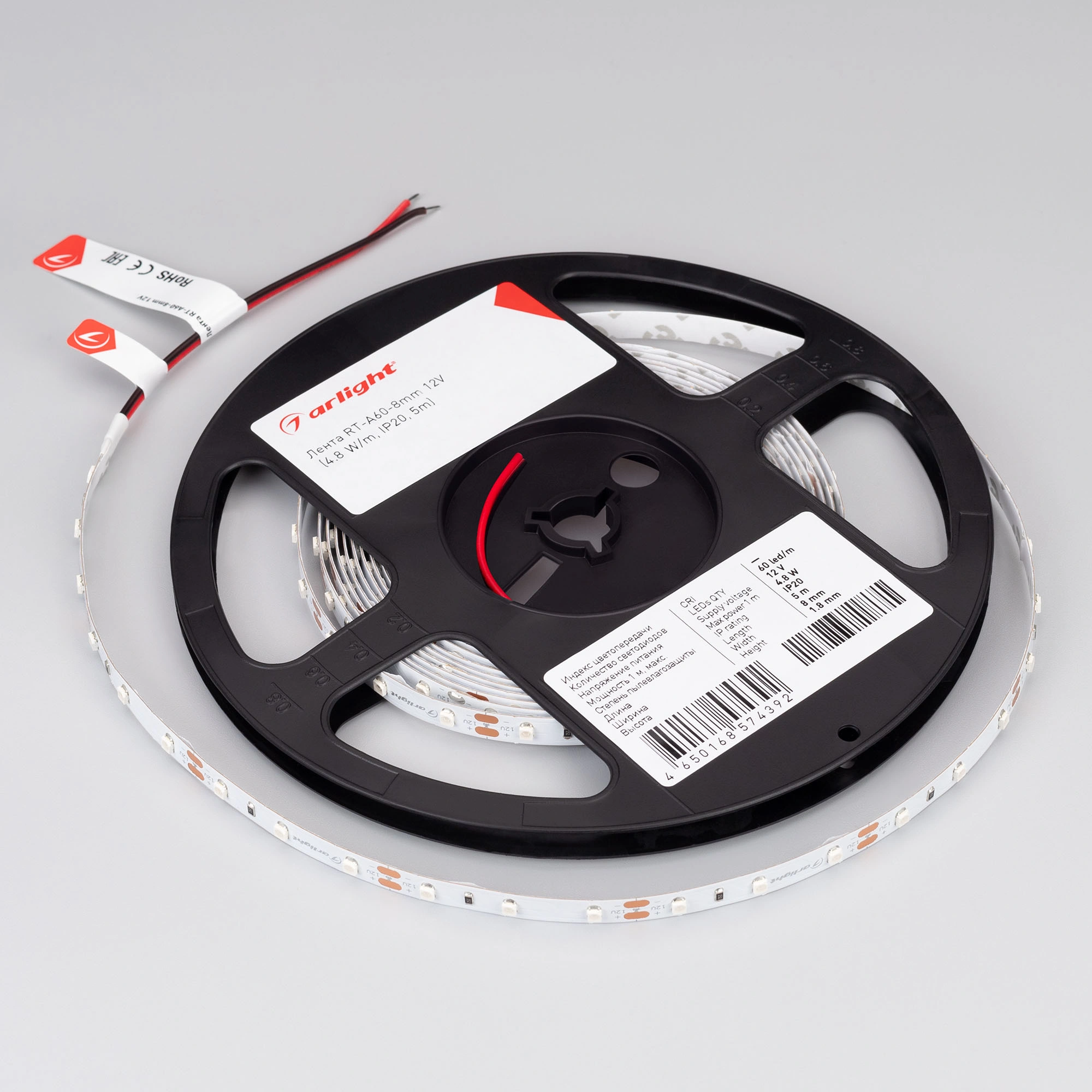 Светодиодная лента RT-A60, открытая. Светодиоды 3528, 60 шт/м (300 шт на 5 м), белая плата, ширина 8 мм, скотч 3M. Цвет СИНИЙ 470 nm, угол 120°. Питание 12V, мощность 4.8 Вт/м (24 Вт на 5 м). Размеры 5000x8x1.5 мм. Мин. отрезок 50 мм, 3 светодиода. Цена за 1 м.