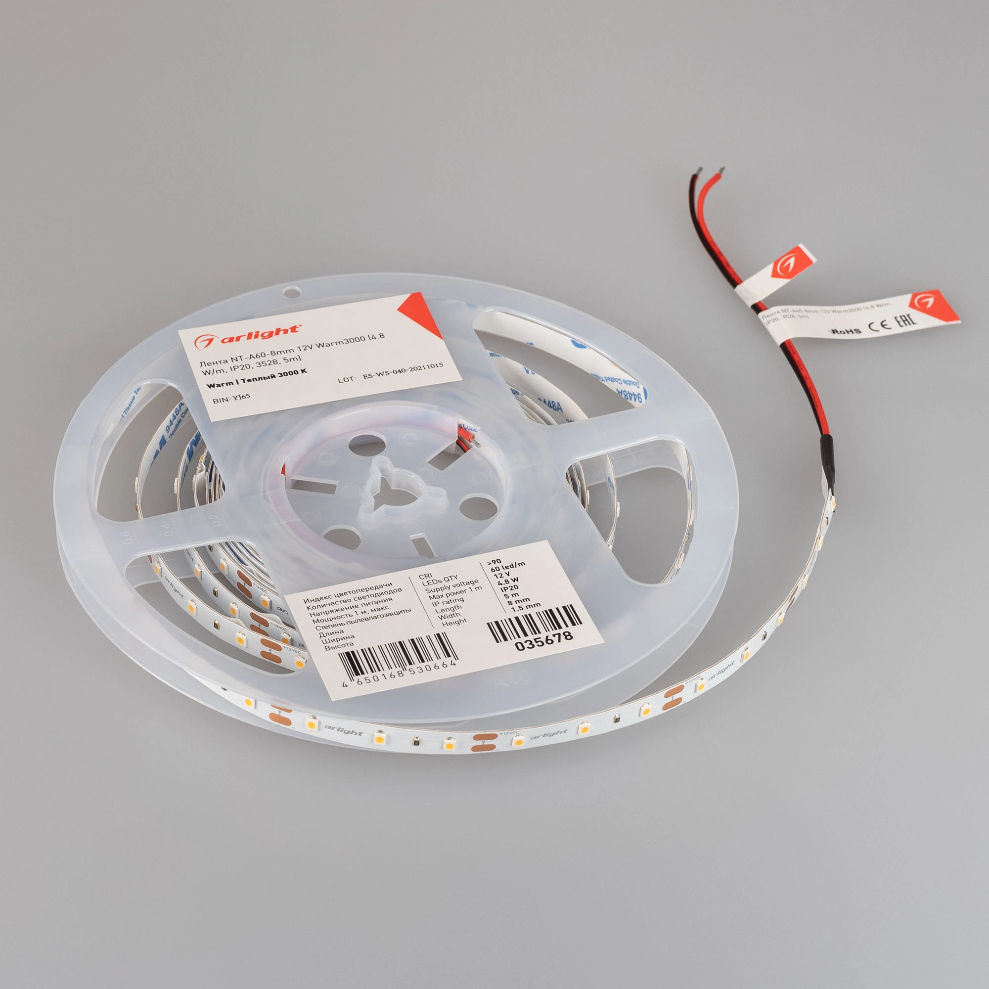 Поставка под заказ от 300м. Светодиодная гибкая лента NT-A60, открытая IP20. Светодиоды 3528, 60 шт/м (300 шт на 5 м), белая плата 8 мм, скотч 3M. Цвет ТЕПЛЫЙ 3000 K, цветопередача CRI>90, угол 120°. Питание 12V, мощность 4.8 Вт/м (24 Вт на 5 м). Размеры 5000х8x1.5мм.Мин.отрезок 50 мм, 3 светодиода. Цена за 1м.