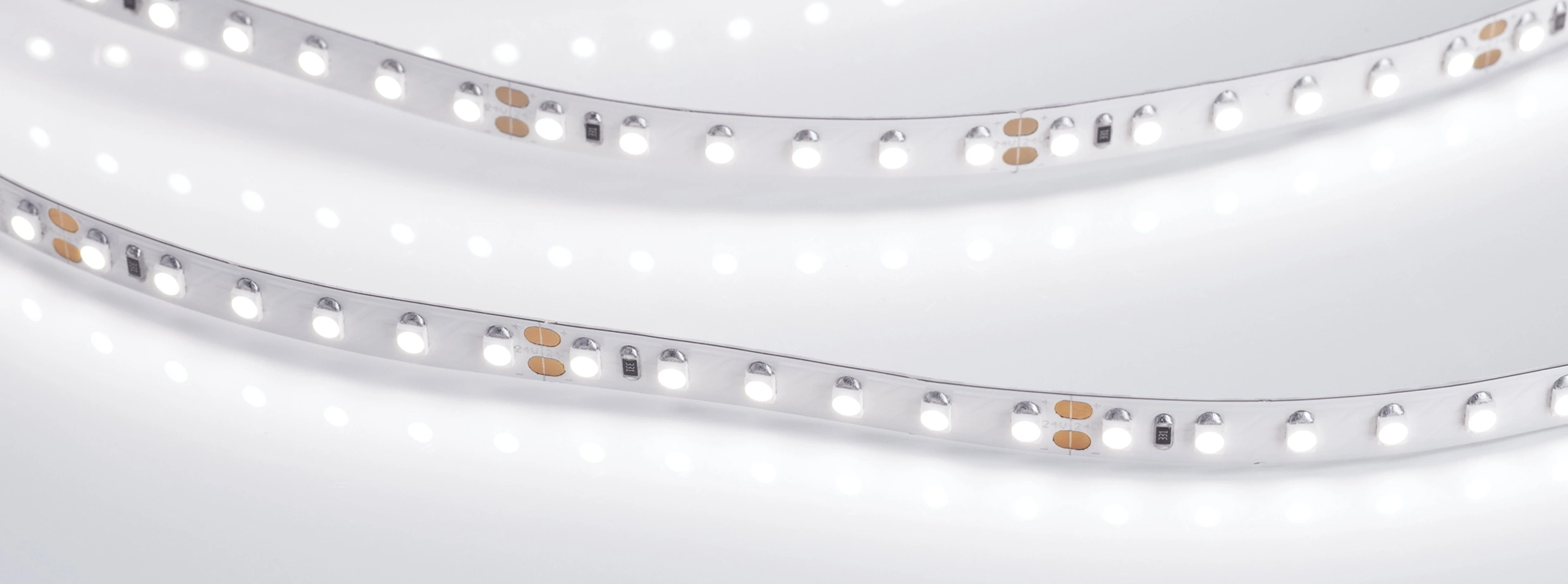 Светодиодная лента серии LUX шириной 8 мм. Питание 24 В и мощность 9.6 Вт/м. Светодиоды 2x SMD 3528 белого цвета свечения (5800 - 6500 К) с плотностью расстановки 120 шт/м. Индекс цветопередачи CRI>85 и степень пылевлагозащиты IP20. Для создания качественной декоративной подсветки в помещениях: подсветка лестниц, ступеней, плинтусов, ниш, мебельных полок, натяжных потолков и витражей. Может использоваться для создания световой рекламы: подсветка лайтбоксов, вывесок, букв, витрин. Обязательна установка на профиль.