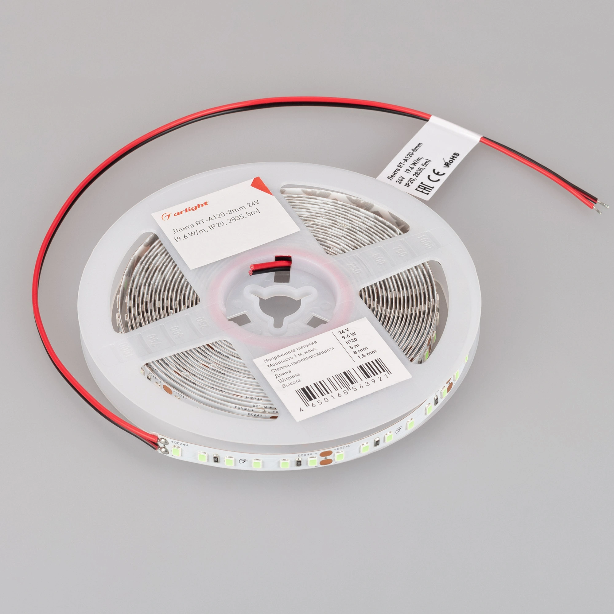 Светодиодная лента RT-A120, открытая. Светодиоды 2835, 120 шт/м (600 шт на 5 м), белая плата, ширина 8 мм, скотч 3M. Цвет БИРЮЗОВЫЙ, угол 120°. Питание 24V, мощность 9.6 Вт/м (48 Вт на 5 м). Размеры 5000x8x1.5 мм. Мин. отрезок 50 мм, 6 светодиодов. Цена за 1 м.