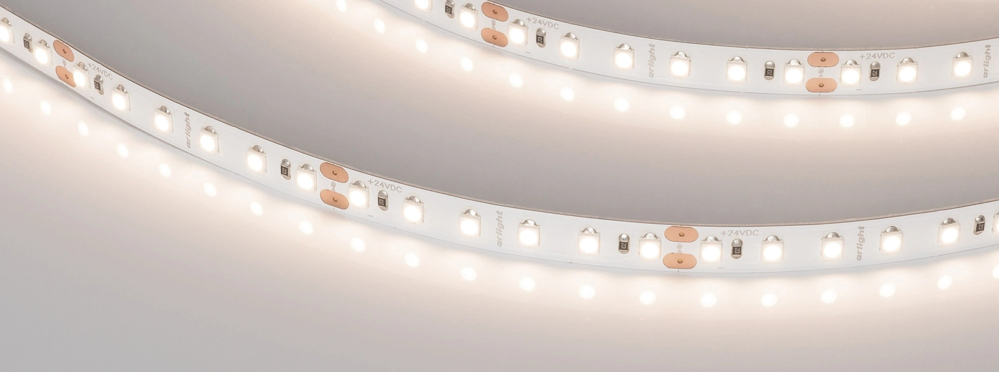 Лента шириной 8 мм со светодиодами SMD 3528 (120 шт/м) теплого белого цвета свечения (3500 К) с индексом цветопередачи CRI>90. Для декоративной подсветки интерьера, потолочных ниш, рабочих зон кухни, рекламных конструкций и витрин. Мощность 9.6 Вт/м, напряжение питания 24 В. Минимальный отрезок 50 мм (6 светодиодов).