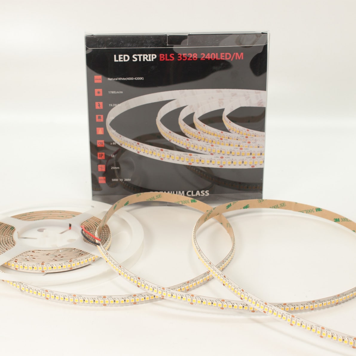 Светодиодная лента премиум класса. Тип светодиода 3528, 240 светодиодов на метр (1200шт на 5 метров), угол свечения 120 градусов, цвет свечения дневной белый 4000-4200K. Напряжение 24V, мощность 96W на 5 метров(19,2W на метр), размеры 5000х10х2мм. В ленте используются светодиоды EPISTAR световой поток с 1 светодиода 7,4Lm. Световой поток на 5 метров 8900Lm. Класс защиты IP33. Катушка 5 метров. Размеры упаковки 180x180x20мм, Вес 200г