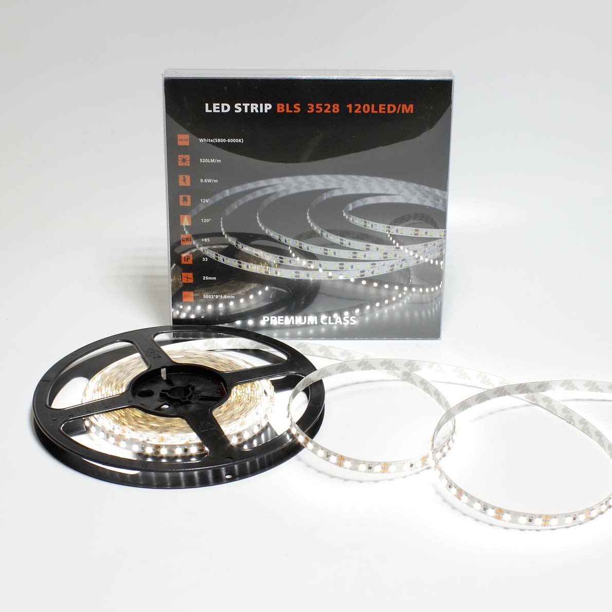 Светодиодная лента премиум класса. Тип светодиода 3528, 120 светодиодов на метр (600шт на 5 метров), угол свечения 120 градусов, цвет свечения дневной белый 4000K. Напряжение 12V, мощность 48W на 5 метров(9,6W на метр), размеры 8x2,2x5003мм. В ленте используются светодиоды EPISTAR световой поток с 1 светодиода 7Lm. Световой поток на 5 метров 4200Lm. Класс защиты IP33. Катушка 5 метров. Размеры упаковки 180x180x20мм, Вес 200г