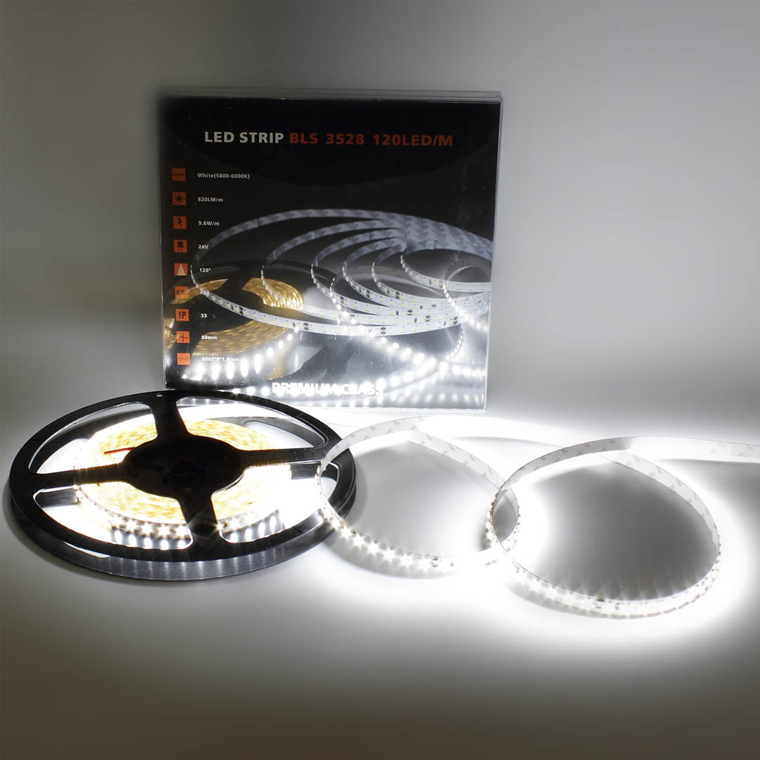Светодиодная лента премиум класса. Тип светодиода 3528, 120 светодиодов на метр (600шт на 5 метров), угол свечения 120 градусов, цвет свечения белый 5800-6000K. Напряжение 24V, мощность 48W на 5 метров(9,6W на метр), размеры 8x1,8x5003мм. В ленте используются светодиоды EPISTAR световой поток с 1 светодиода 5,2Lm. Световой поток на 5 метров 3120Lm. Класс защиты IP33. Катушка 5 метров. Размеры упаковки 180x180x20мм, Вес 200г