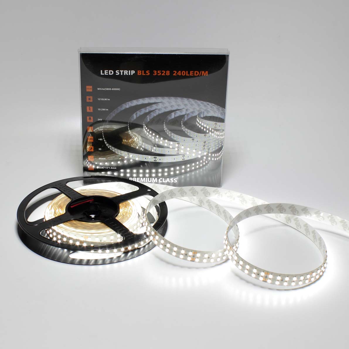Светодиодная лента премиум класса. Тип светодиода 3528, 240 светодиодов на метр (1200шт на 5 метров), угол свечения 120 градусов, цвет свечения белый 5800-6000K. Напряжение 24V, мощность 96W на 5 метров(19,2W на метр), размеры 15x1,8x5003мм. В ленте используются светодиоды EPISTAR световой поток с 1 светодиода 5Lm. Световой поток на 5 метров 6000Lm. Класс защиты IP33. Катушка 5 метров. Размеры упаковки 180x180x20мм, Вес 200г