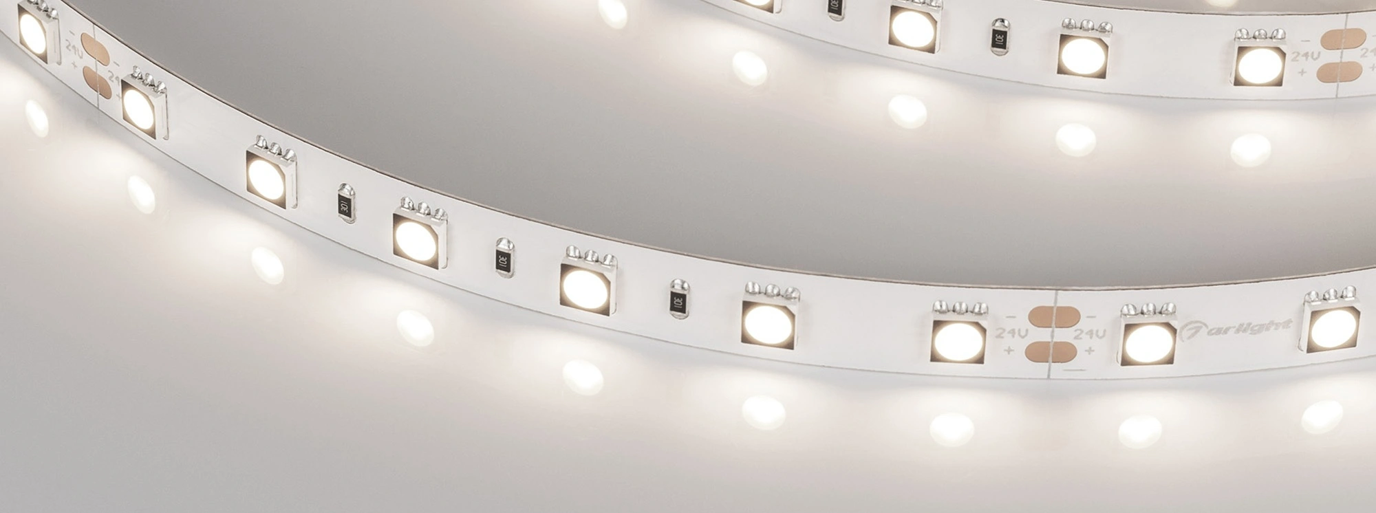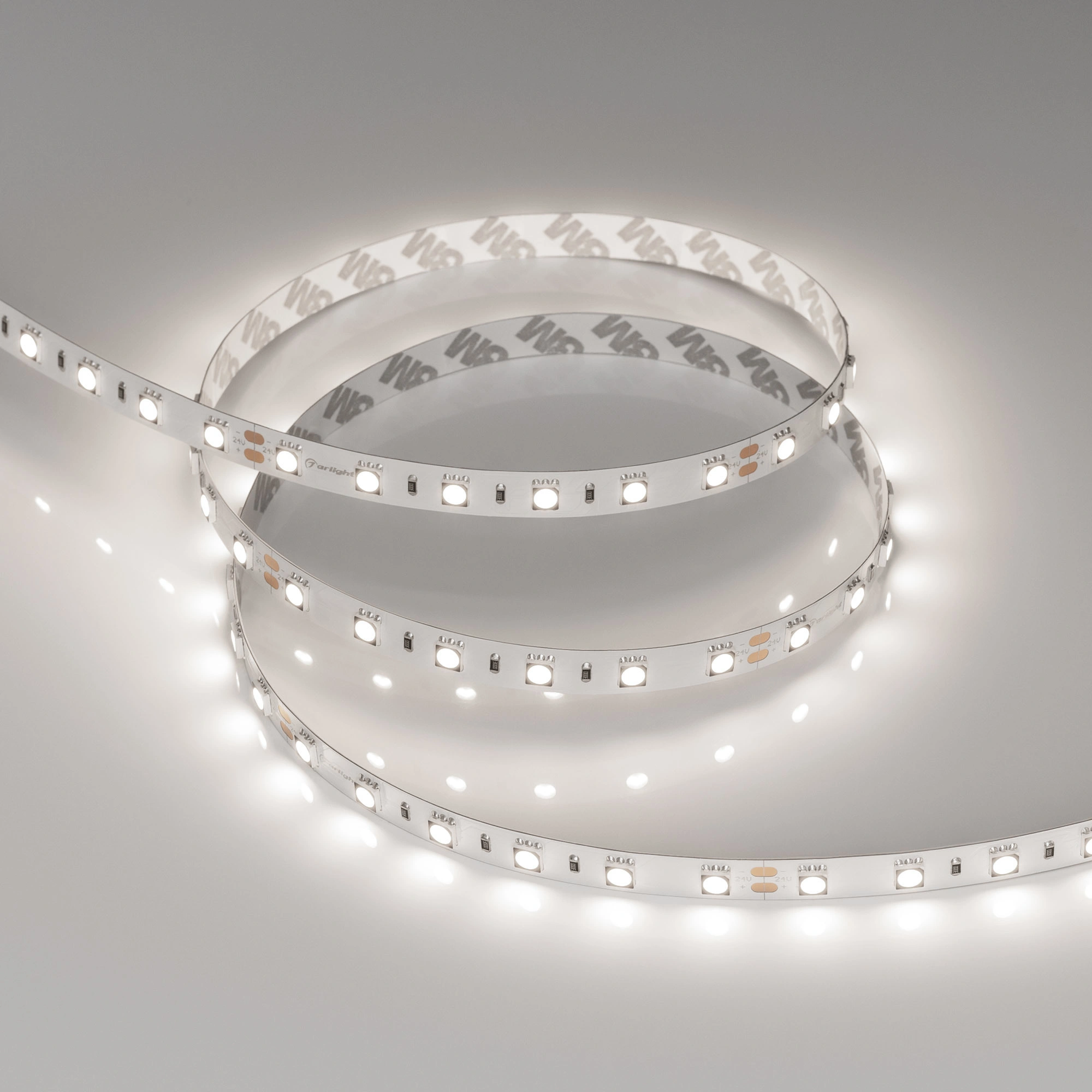 Светодиодная лента RT-B60, открытая. Светодиоды 5060, 60 шт/м (300 шт на 5 м), белая плата, ширина 10 мм, скотч 3M. Цвет ДНЕВНОЙ 5000 K, цветопередача CRI 95..98, угол 120°. Питание 24V, мощность 14.4 Вт/м (72 Вт на 5 м). Размеры 5000x10x2.2 мм. Мин.отрезок 100 мм, 6 светодиодов. Цена за 1 м.