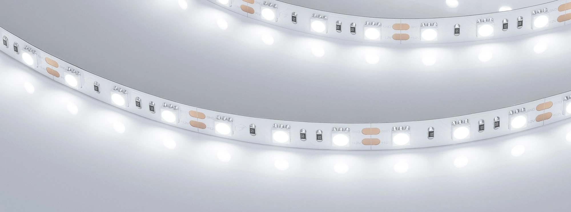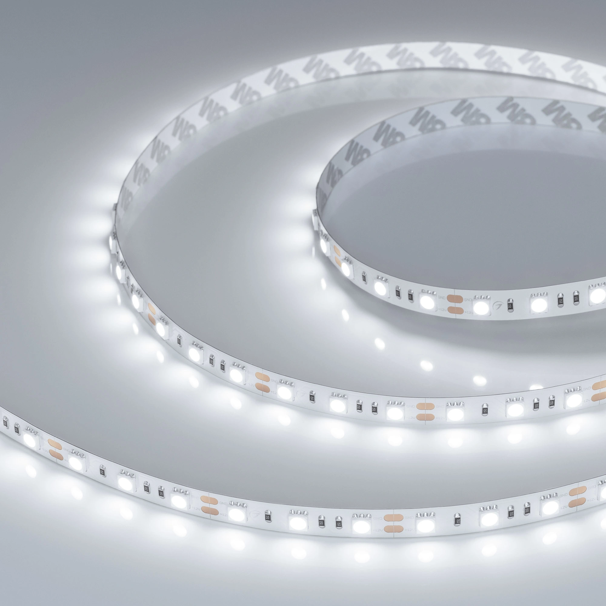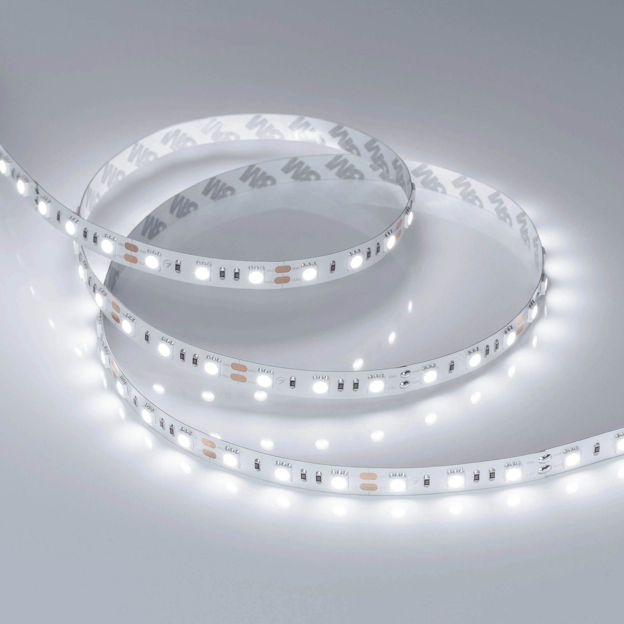 Светодиодная лента RT-B60, открытая. Светодиоды 5060, 60 шт/м (300 шт на 5 м), белая плата, ширина 10 мм, скотч 3M. Цвет БЕЛЫЙ 6000 K, цветопередача CRI>85, угол 120°. Питание 12V, мощность 14.4 Вт/м (72 Вт на 5 м). Размеры 5000x10x2.2 мм. Мин. отрезок 50 мм, 3 светодиода. Цена за 1 м.
