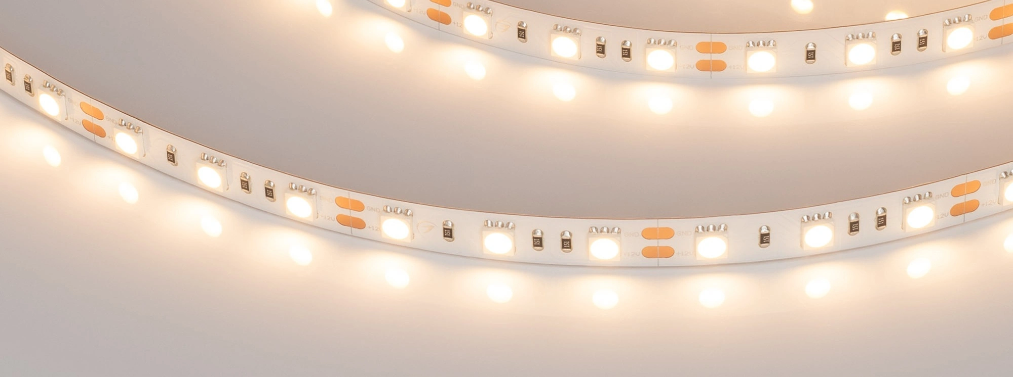 Светодиодная лента RT-B60, открытая. Светодиоды 5060, 60 шт/м (300 шт на 5 м), белая плата, ширина 10 мм, скотч 3M. Цвет ТЁПЛЫЙ 2700 K, цветопередача CRI>85, угол 120°. Питание 12V, мощность 14.4 Вт/м (72 Вт на 5 м). Размеры 5000x10x2.2 мм. Мин. отрезок 50 мм, 3 светодиода. Цена за 1 м.