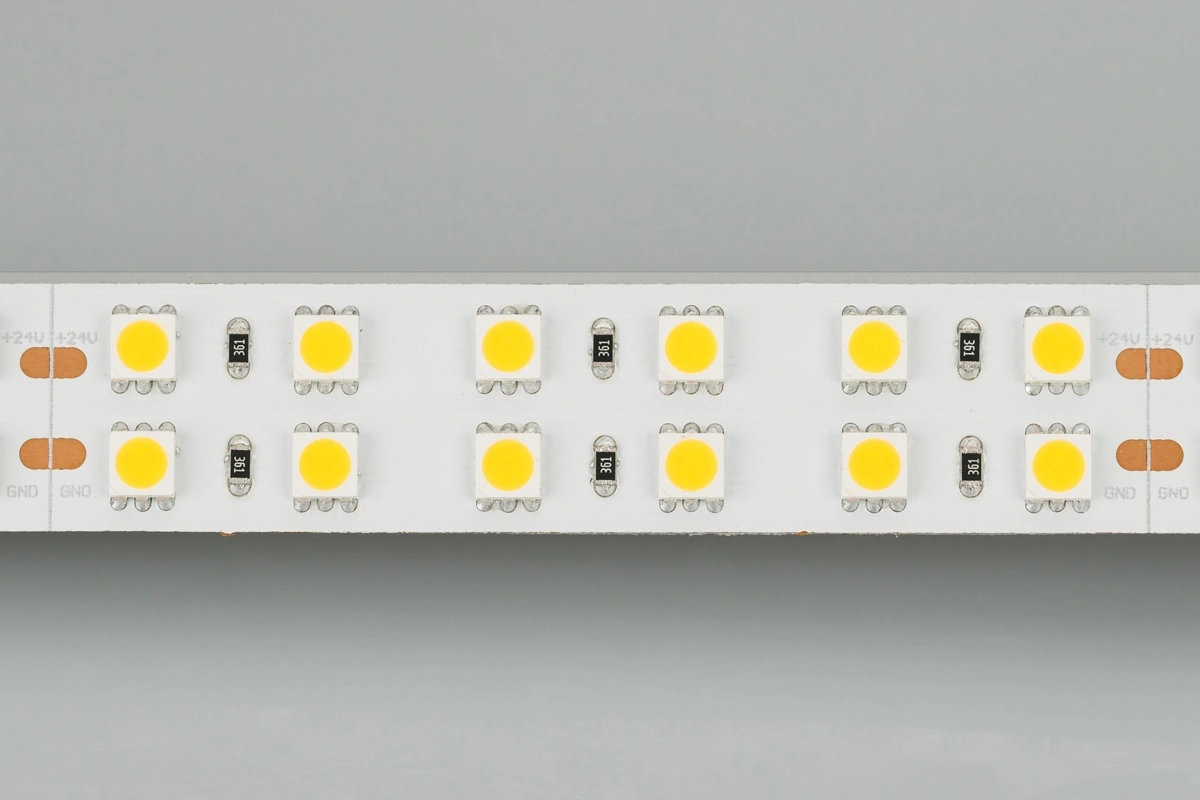 Поставка под заказ от 1050 м.Гибкая лента LUX, светодиоды smd 5060, 144шт/м (720шт на 5м), скотч 3М. Цвет ТЁПЛЫЙ 2600-2800K. Питание 24V, мощность 34.4 Вт/м (172 Вт на 5м), угол 120°, цветопередача CRI>85. Размеры 5000х19x2.2мм. Мин.отрезок 83.33мм, 12шт светодиодов. Пакет 5м. Цена за 1м. Обязательная установка на профиль.