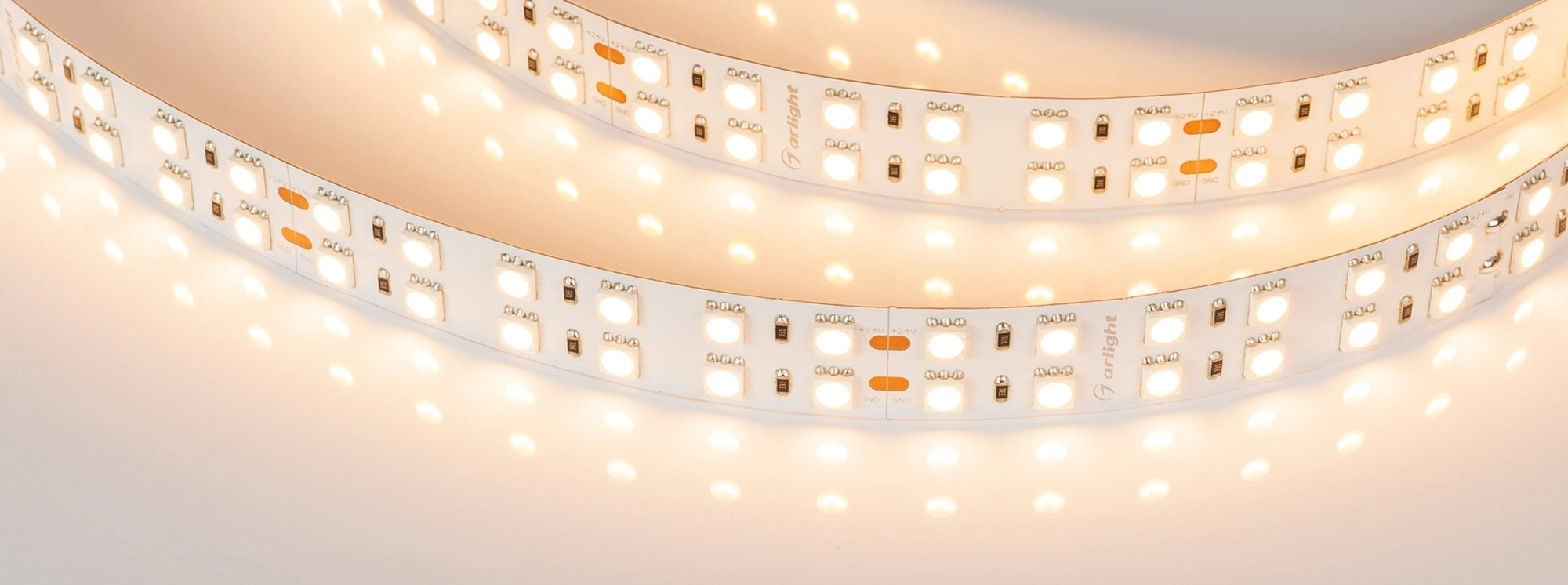 Широкая двухрядная лента LUX шириной 19 мм с индексом цветопередачи CRI>85. Светодиоды SMD 5060 (144 шт/м) с теплым белым цветом свечения (2600–2800 К). Мощность 34.4 Вт/м, напряжение питания 24 В. Минимальный отрезок 83.33 мм (12 светодиодов). Декоративная подсветка интерьеров, потолочных ниш, рабочих зон кухни, мебели. Встроенные линии света для основного освещения. Создание накладных и подвесных светильников из алюминиевого профиля. Обязательна установка на алюминиевый профиль.