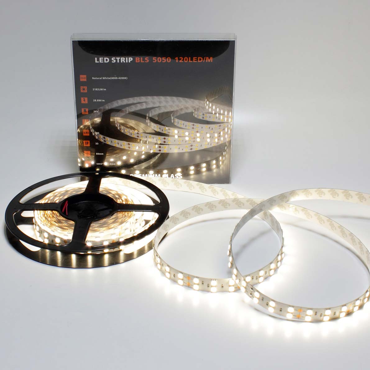 Светодиодная лента премиум класса. Тип светодиода 5050, 120 светодиодов на метр (600шт на 5 метров), угол свечения 120 градусов, цвет свечения дневной белый 4000-4200K. Напряжение 24V, мощность 144W на 5 метров(28,8W на метр), размеры 15x2,2x5003мм. В ленте используются светодиоды EPISTAR световой поток с 1 светодиода 18Lm. Световой поток на 5 метров 10800Lm. Класс защиты IP33. Катушка 5 метров. Размеры упаковки 180x180x20мм, Вес 200г