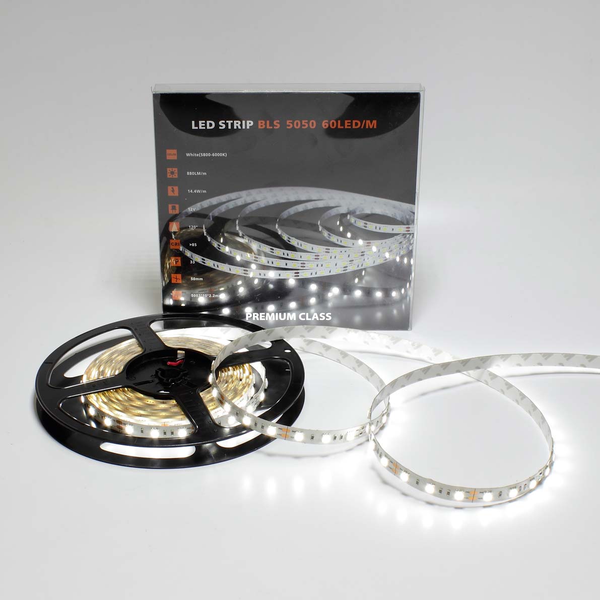Светодиодная лента премиум класса. Тип светодиода 5050, 60 светодиодов на метр (300шт на 5 метров), угол свечения 120 градусов, цвет свечения белый 5800-6000K. Напряжение 12V, мощность 72W на 5 метров(14,4W на метр), размеры 10x2,2x5003мм. В ленте используются светодиоды EPISTAR световой поток с 1 светодиода 14,6Lm. Световой поток на 5 метров 4400Lm. Класс защиты IP33. Катушка 5 метров. Размеры упаковки 180x180x20мм, Вес 200г