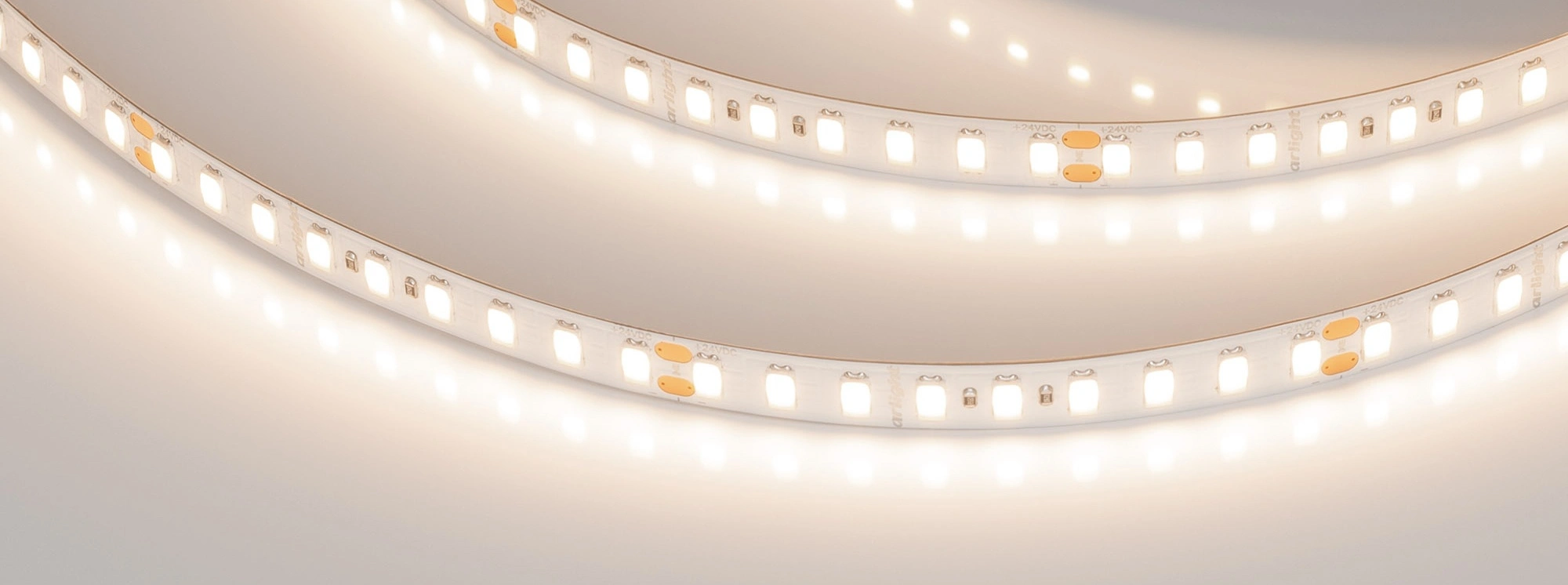 Светодиодная лента ULTRA-C126, открытая IP20. Светодиоды 5630, 126 шт/м (630 шт на 5 м), белая плата, ширина 10 мм, скотч 3M. Цвет ТЁПЛЫЙ 3500 K, цветопередача CRI>80, угол 120°. Питание 24 В, мощность 14.4 Вт/м (72 Вт на 5 м). Размеры 5000x10x1.4 мм. Мин. отрезок 71.4 мм, 9 светодиодов. Цена за 1 м.