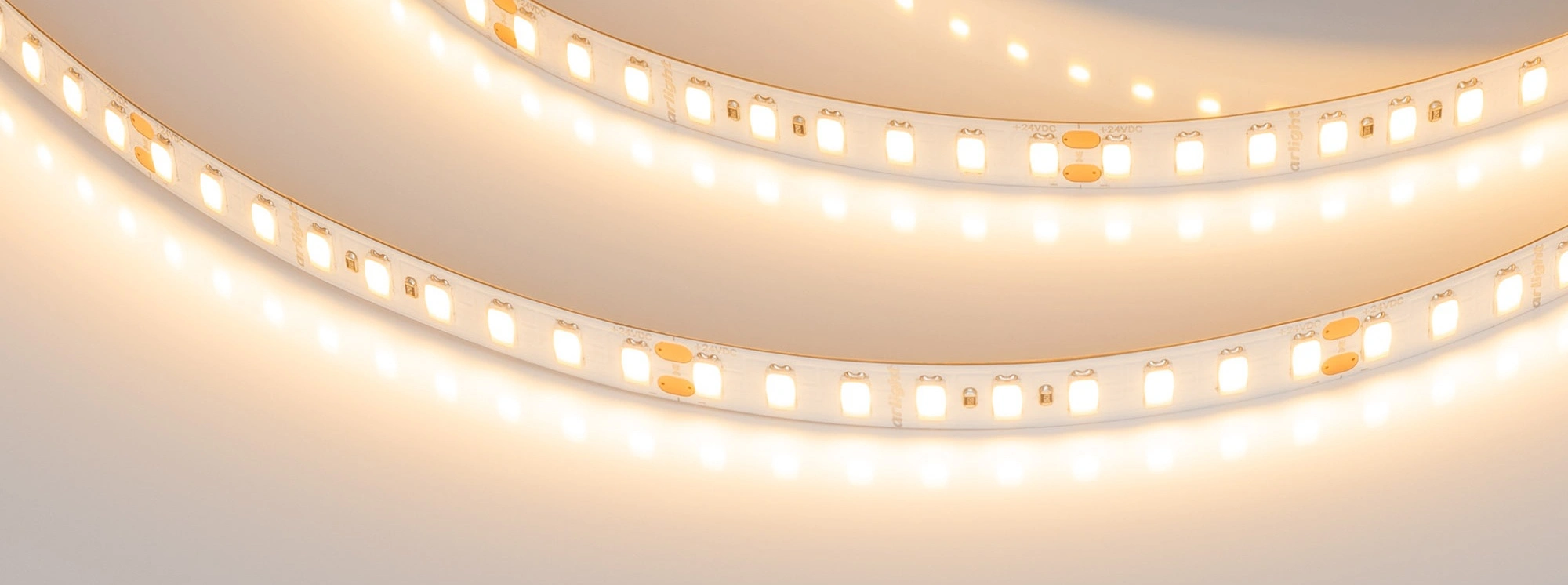 Светодиодная лента ULTRA-C126, открытая IP20. Светодиоды 5630, 126 шт/м (630 шт на 5 м), белая плата, ширина 10 мм, скотч 3M. Цвет ТЁПЛЫЙ 2700 K, цветопередача CRI>80, угол 120°. Питание 24 В, мощность 14.4 Вт/м (72 Вт на 5 м). Размеры 5000x10x1.4 мм. Мин. отрезок 71.4 мм, 9 светодиодов. Цена за 1 м.