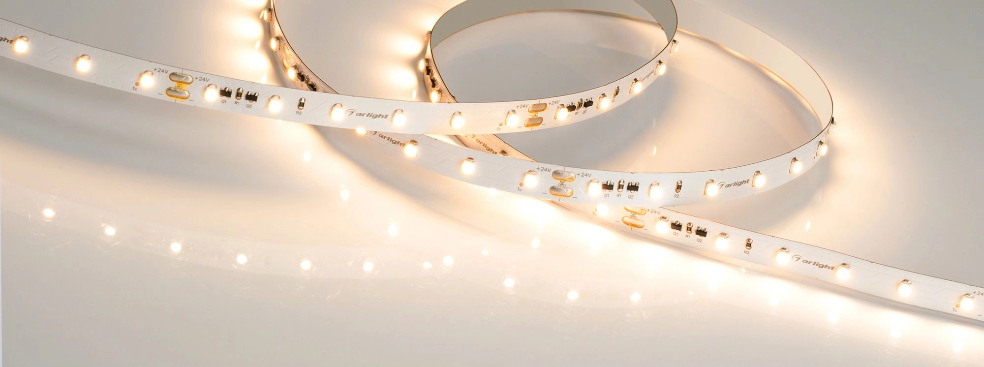 Стабилизированная лента длиной 20 метров и шириной 10 мм. Стабилизаторы тока обеспечивают равномерное свечение по всей длине ленты даже при подключении только с одной стороны. Светодиоды SMD 3528 (60 шт/м) теплого белого цвета свечения (2600–2800 K) с индексом цветопередачи CRI>80. Мощность 4.8 Вт/м, напряжение питания 24 В. Подсветка потолочных ниш, декоративная подсветка, создание контуров рекламных объектов. Совместима с любыми диммерами (ШИМ). Минимальный отрезок 100 мм (6 светодиодов).