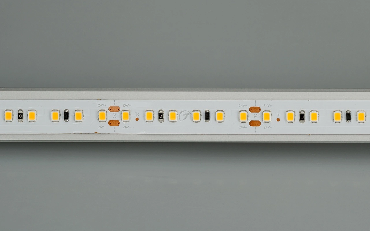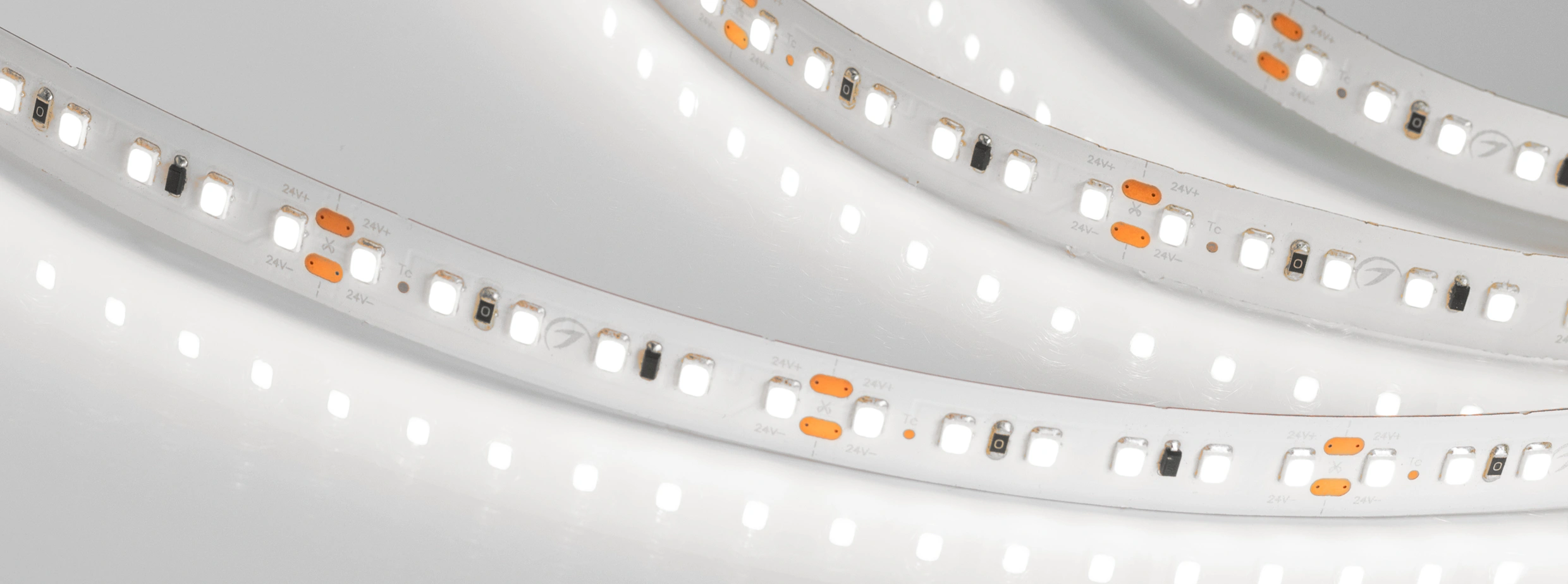 Стабилизированная лента длиной 20 метров и шириной 12 мм. Стабилизаторы тока обеспечивают равномерное свечение по всей длине ленты даже при подключении только с одной стороны. Светодиоды SMD 2835 (120 шт/м) дневного белого цвета свечения (3800–4200 K) с индексом цветопередачи CRI>85. Мощность 9.6 Вт/м, напряжение питания 24 В. Подсветка потолочных ниш, декоративная подсветка, создание контуров рекламных объектов. Совместима с любыми диммерами (ШИМ). Минимальный отрезок 50 мм (6 светодиодов).