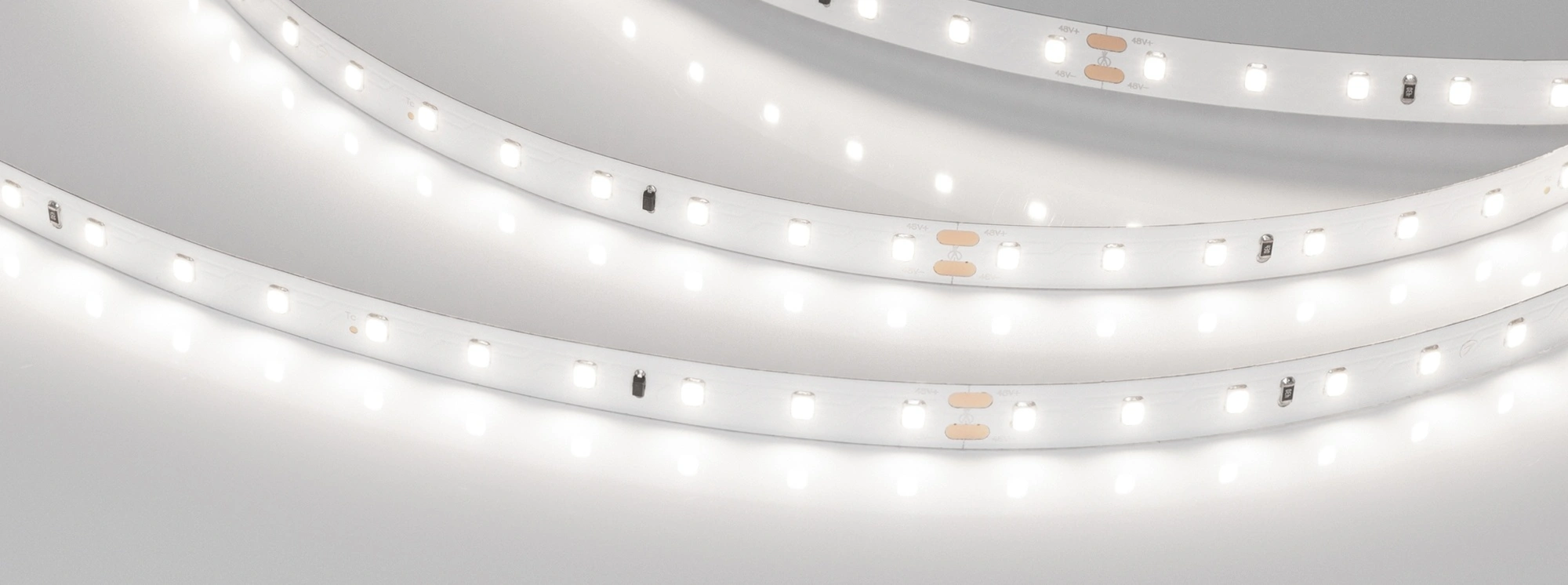 Стабилизированная светодиодная лента длиной 60м с подключением с одной стороны IC-A72, открытая. Светодиоды 2835, 72 шт/м (4320 шт на 60 м), белая плата, ширина 10 мм, скотч 3M. Цвет БЕЛЫЙ 6000К, цветопередача CRI>85, угол 120°. Питание 48 В, мощность 3.8 Вт/м (228 Вт на 60 м). Размеры 60000х10х1.6 мм. Мин.отрезок 166.67 мм, 12 светодиодов. Цена за 1м.