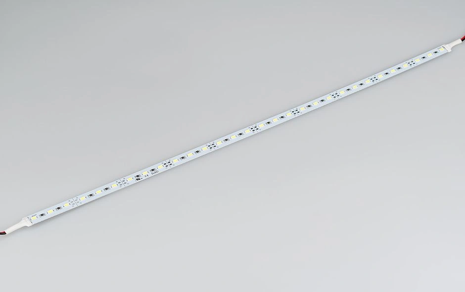 Светодиодная линейка шириной 12 мм. Светодиоды SMD 5730 холодного белого цвета свечения (9000 К) с индексом цветопередачи CRI>75. Толщина алюминиевой платы 1 мм. Мощность 6 Вт, напряжение питания 12 В. Длина проводов для подключения с двух сторон 8 см. Минимальный отрезок 50 мм.