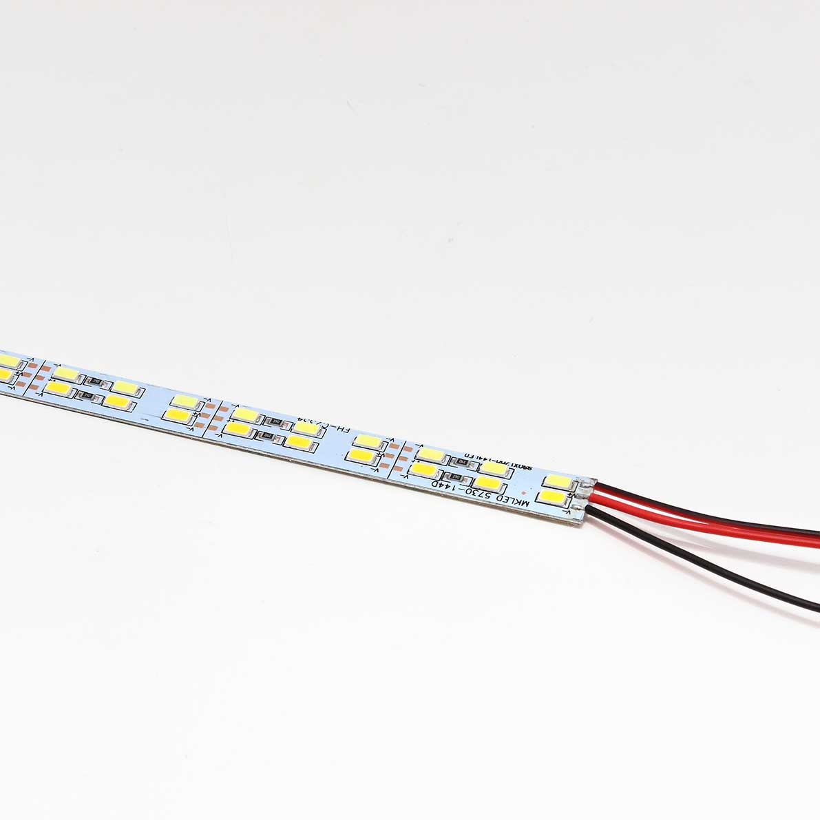 Светодиодная линейка на алюминиевой основе для ювелирных витрин. Напряжение 12В, мощность 2х36Вт (2 канала), тип светодиода 5730- 144 штуки, цвет свечения белый 6000-6500K (72led) / теплый белый 3000-3500К (72led), угол свечения 120 градусов, световая отдача 5040Lm, шаг нарезки 41,2мм. Размеры 990х12x2,2мм. Вес 35г.