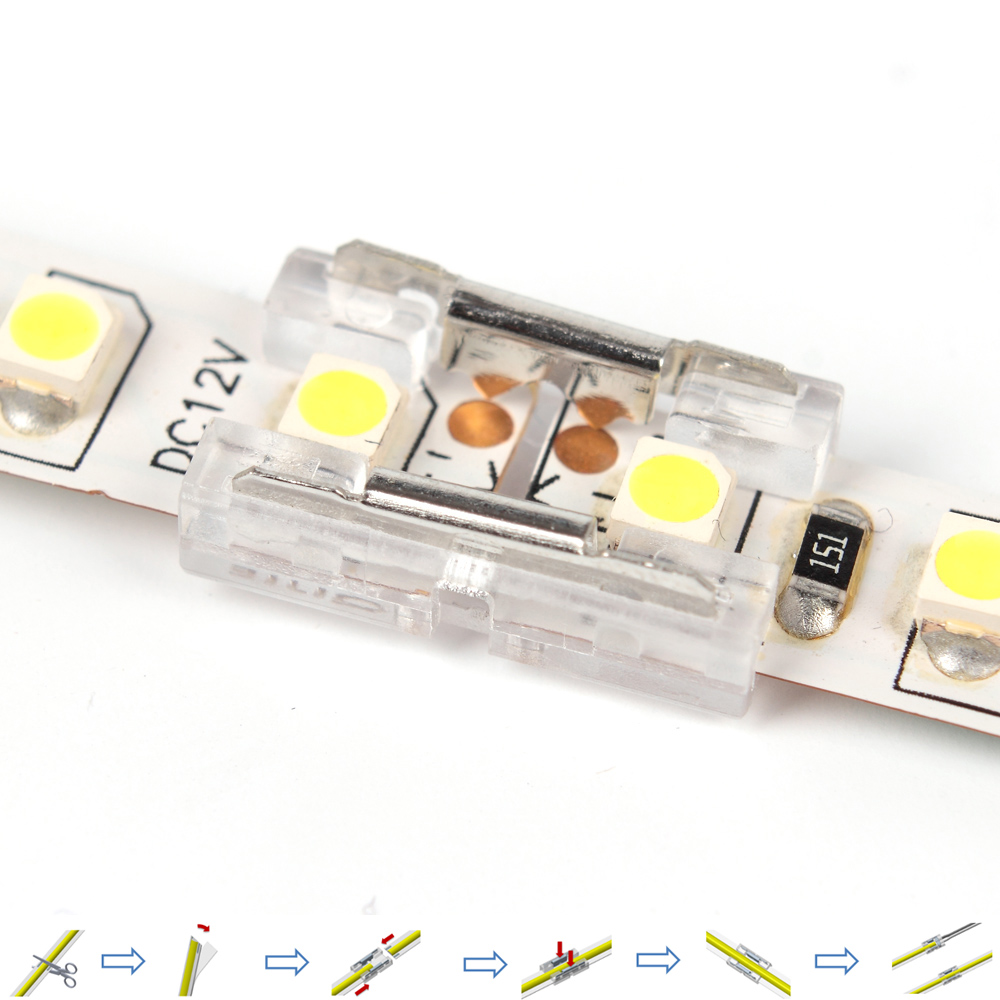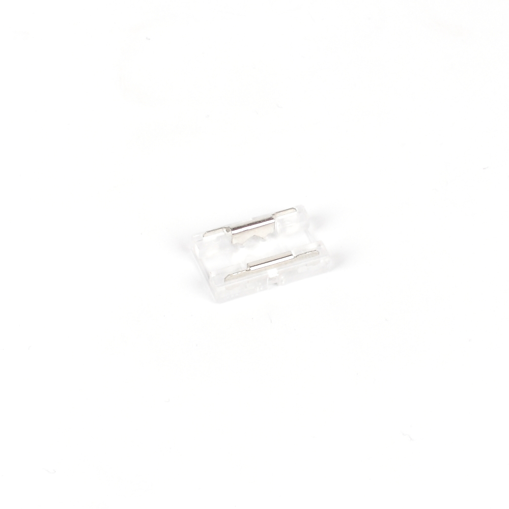 Коннектор соединительный 2pin, для светодиодных лент с smd и cob светодиодами, с шириной шлейфа 8мм. Максимальный ток 5А, 0-36В. Степень защиты IP20. Размеры 15,8x9,8x4,4мм. Вес 1г.
