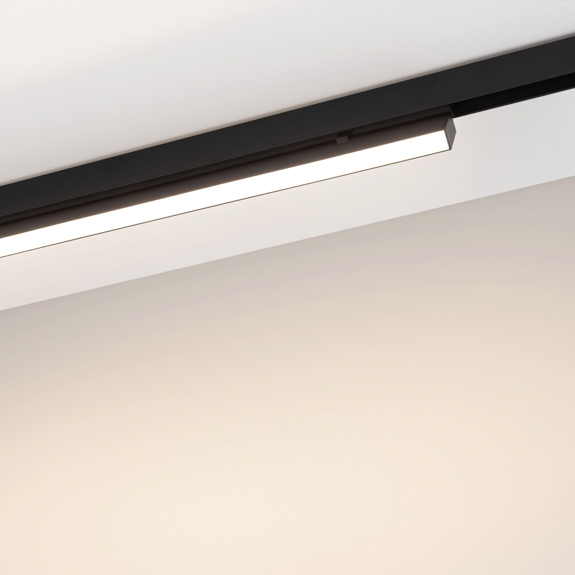 Светильник поворотный для магнитных треков шириной 25мм, 18Вт. Цвет свечения ДНЕВНОЙ 4000K, световой поток 1200 лм, угол 100°, CRI>90. Корпус прямоугольный, металл, цвет черный, IP20. Размеры LxWxH 604x20x46мм. Входное напряжение DC24V, мощность 18Вт. Драйвер DС24V/AC230V поставляется отдельно. Диммируется только с 026407, 027633.