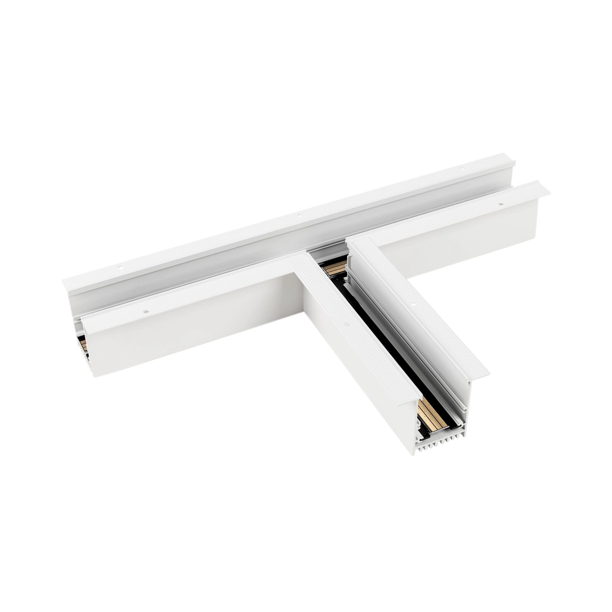 Тройной прямой коннектор MAG-CON-4560-F-T90 (WH) для встраиваемого трека MAG-TRACK-4560-F. Напряжение питания 24 В. Аксессуары для соединения с треком приобретаются отдельно.