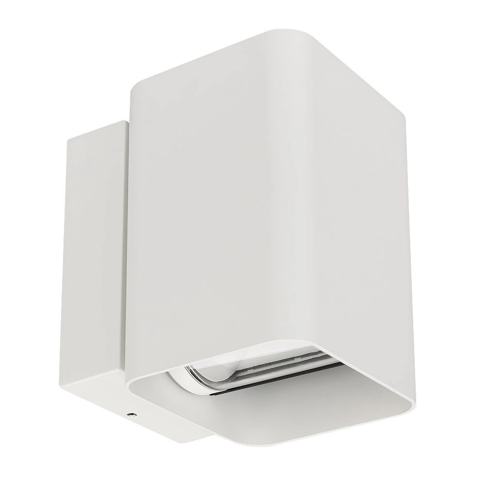 Уличный светодиодный светильник для стен, изменяемый угол освещения 0°-80°, свет вверх-вниз на 2 стороны. Цвет ТЕПЛЫЙ БЕЛЫЙ 3000К, светодиоды 2x6Вт CREE (750 лм). Влагозащищенный корпус IP54 - белый (RAL9003) алюминий, экран ударопрочный PC. Питание 230В, мощность 12 Вт. Размеры ВхШхГ -138х104х129 мм.