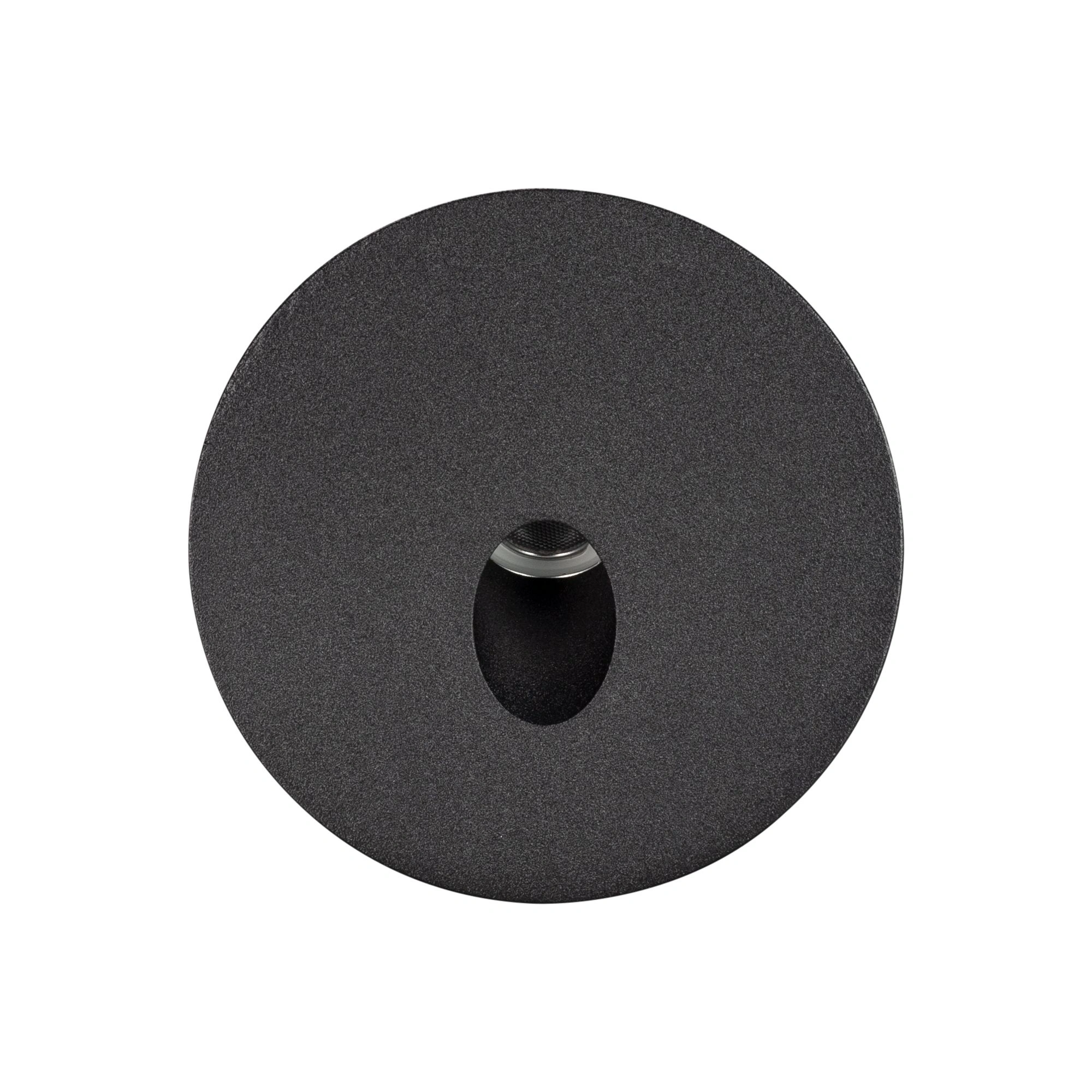 Светодиодный встраиваемый круглый светильник для стен, лестниц, 3Вт. Цвет ТЕПЛЫЙ 3000К, световой поток 120лм, угол 30°, CRI>80. Влагозащищенный корпус IP65, чёрный алюминий. Питание AC230V, мощность 3Вт. Размеры DxH 70x97мм (закладная часть Ø62x95мм).