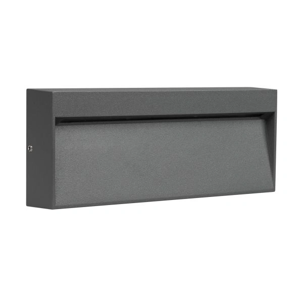 Светодиодный накладной прямоугольный светильник для стен, лестниц, 8Вт. Цвет ТЕПЛЫЙ БЕЛЫЙ 3000K, св.поток 300лм, CRI(Ra)>80, угол 65°, асимметричный свет. Размер 200x80x32мм. Влагозащищенный корпус IP65, алюминий серого цвета. Питание AC230V, 8Вт, встроенный драйвер.