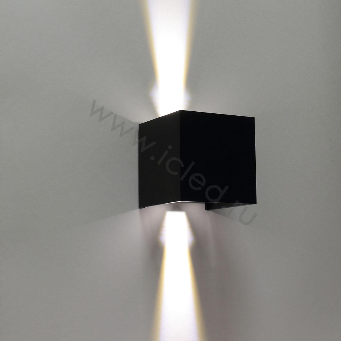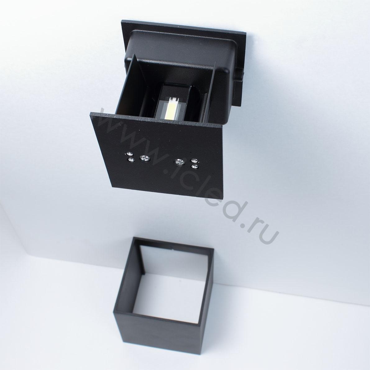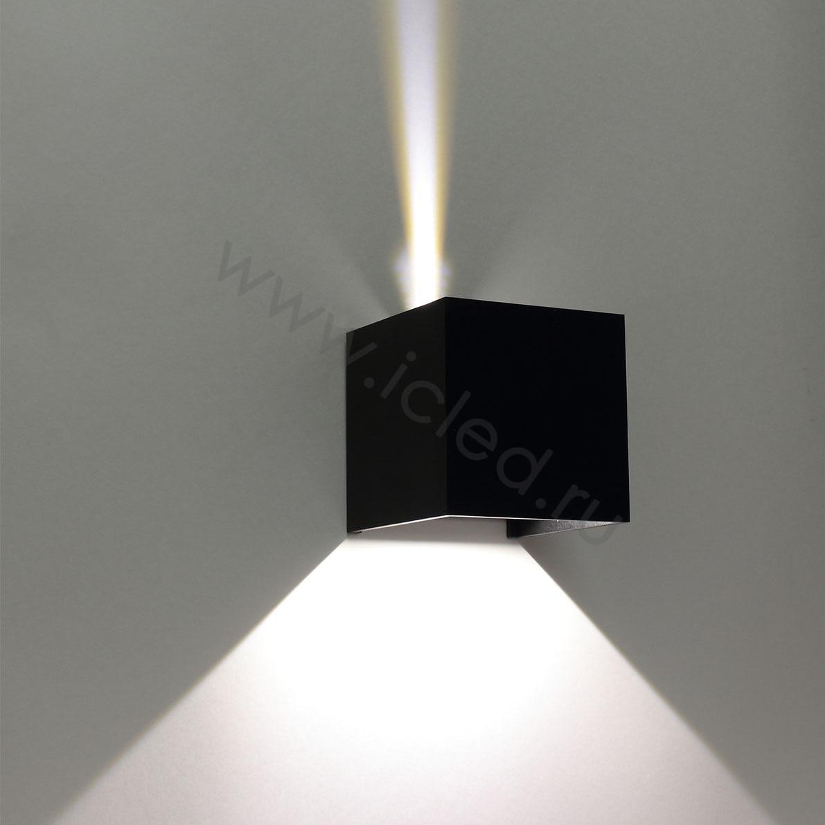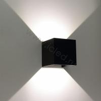 Светодиодный светильник (бра). Корпус черный квадратный алюминиевый. Входное напряжение 85-265V, цвет свечения теплый белый 3000-3500К, мощность 2х3W, световой поток 400lm, изменяемый угол свечения 2х0-90 градусов, класс защиты IP65. Коэффициент цветопередачи >80. Драйвер 12-24В, 300мА. Размеры 100х100х100мм. Вес 700г.