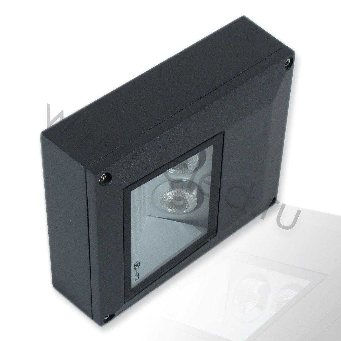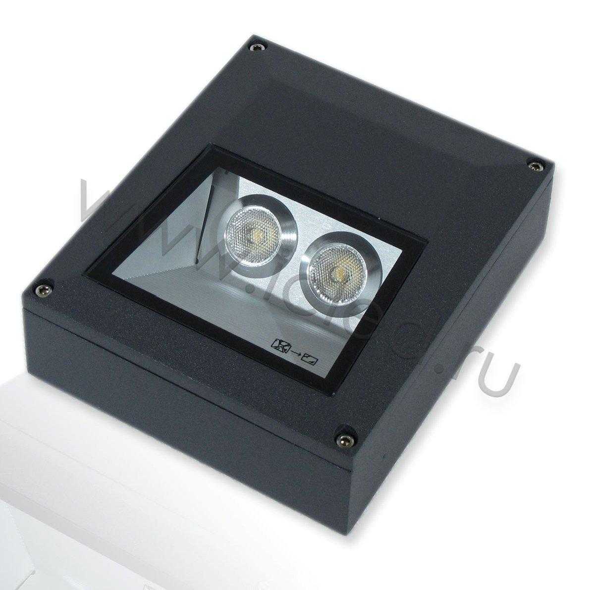 Светодиодный светильник квадратный. Корпус серый. Входное напряжение AC 100-240 V , светодиоды 2 х 1W EDISON, цвет свечения белый 5000К, световой поток 220 lm, угол свечения 25 градусов, коэффициент CRI >85, класс защиты IP54, материал штампованный сплав алюминия. Размеры ширина 136 мм, высота 160 мм, глубина 52 мм.