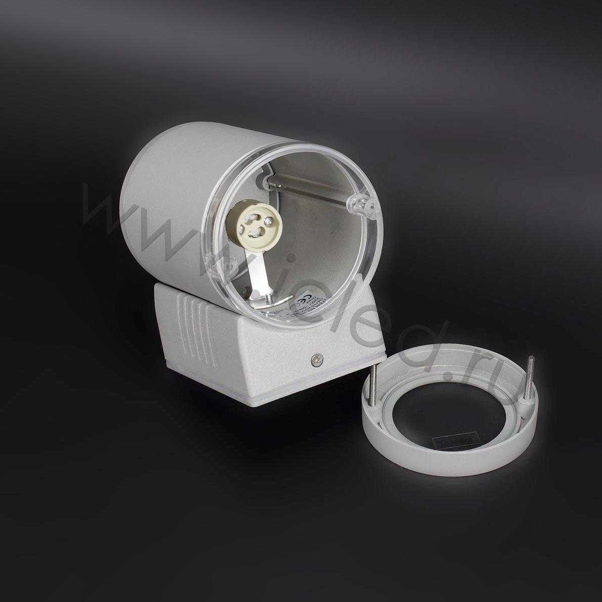 Светодиодный светильник. Корпус серый. Входное напряжение 220V , Цоколь GU10 для установки ламп до 50Вт (лампа в комплект не входит), класс защиты IP54, материал алюминий. Диаметр 98мм, высота 156мм, глубина 140мм.
