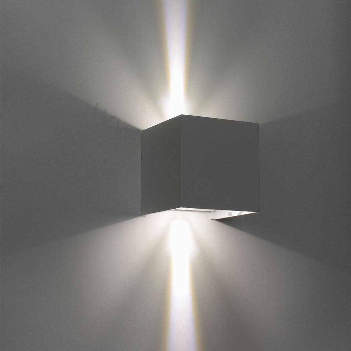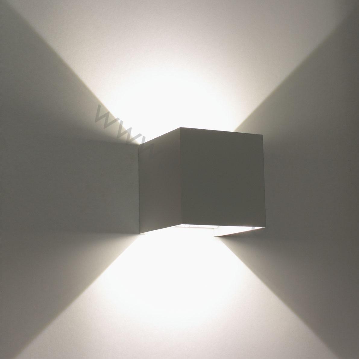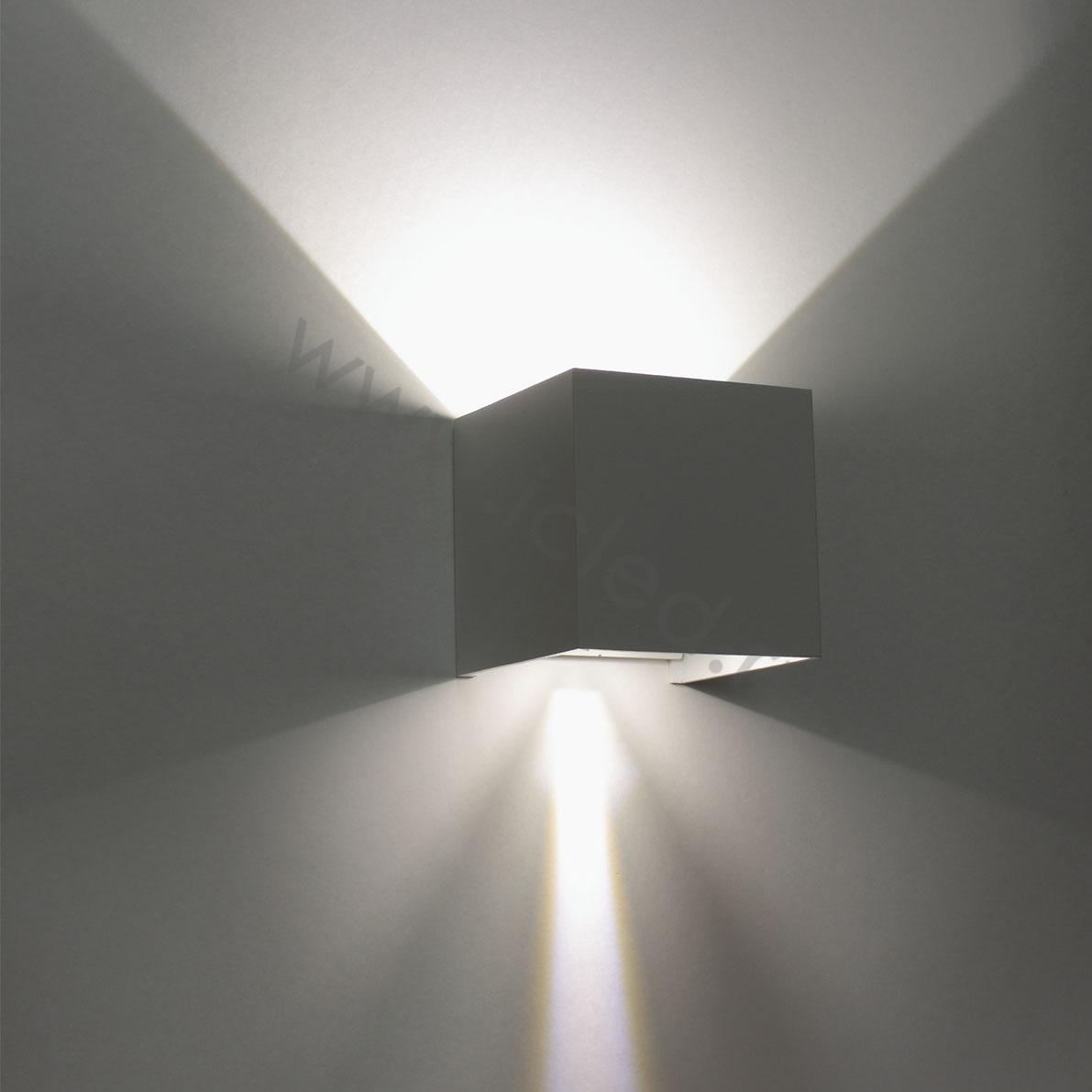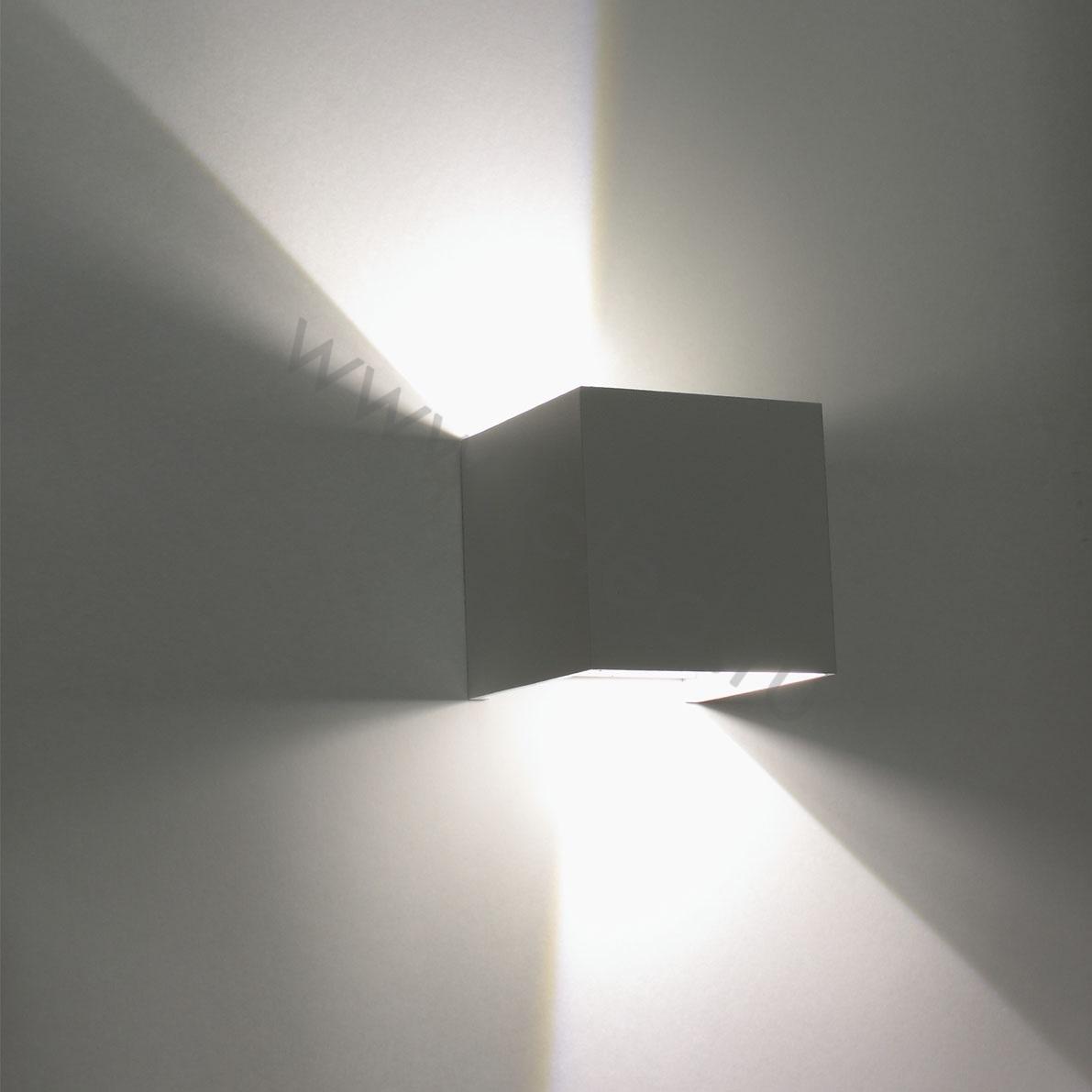 Светодиодный светильник (бра). Корпус белый квадратный алюминиевый. Входное напряжение 85-265V, цвет свечения теплый белый 3000-3500К, мощность 2х3W, световой поток 400lm, изменяемый угол свечения 2х0-90 градусов, класс защиты IP65. Коэффициент цветопередачи >80. Драйвер 12-24В, 300мА. Размеры 100х100х100мм. Вес 700г.